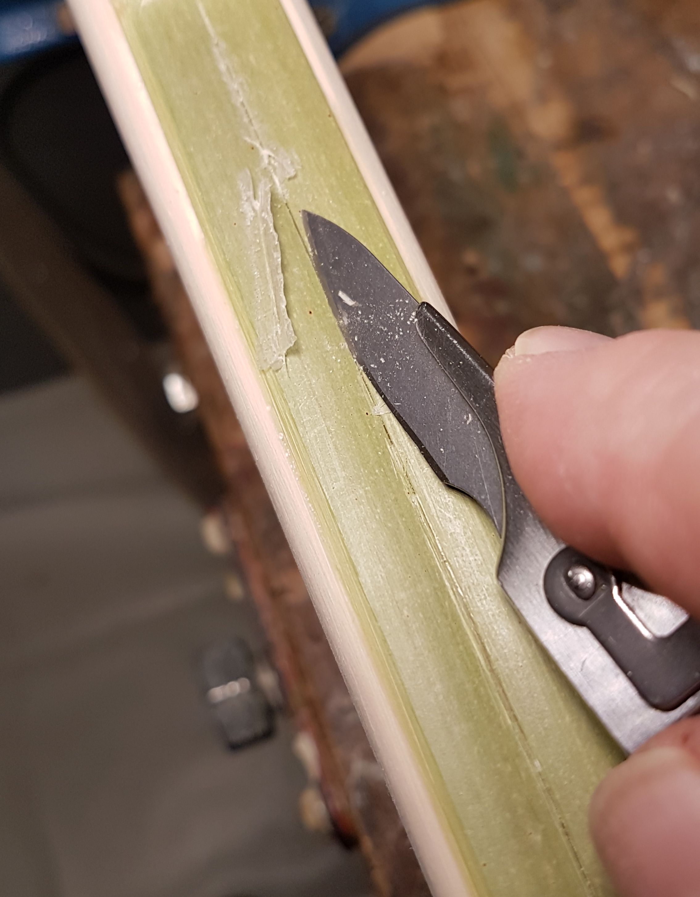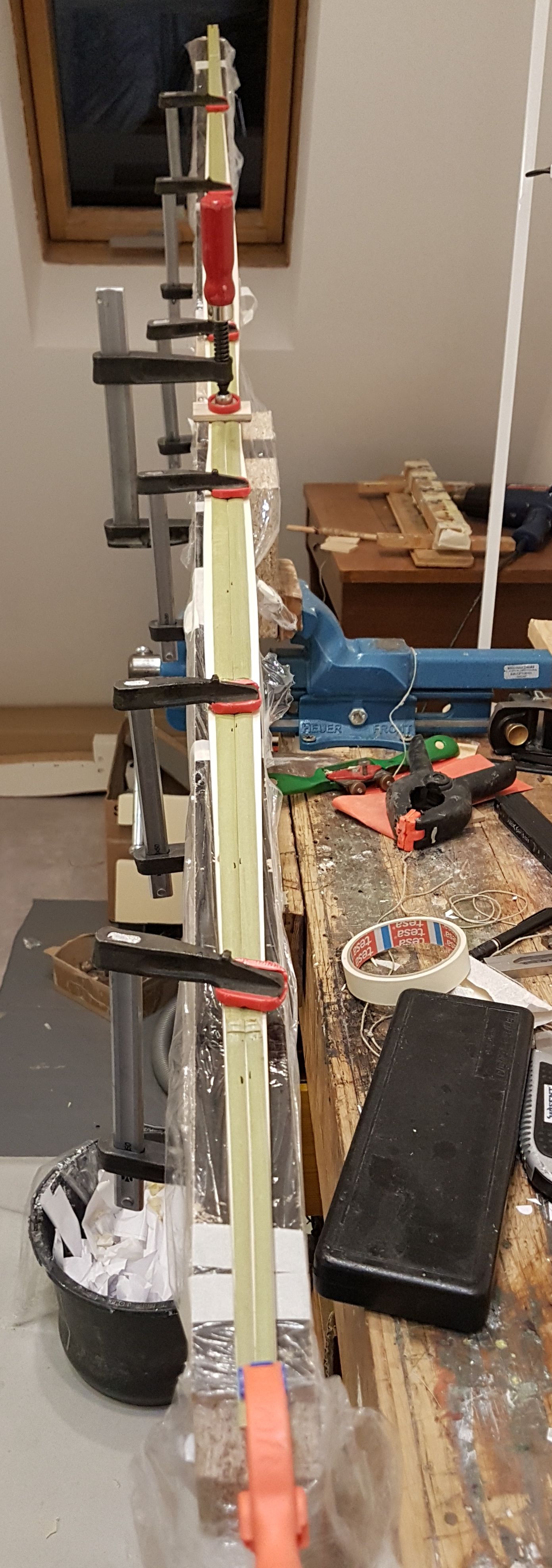 Die Rohhaut wird zunächst gewässert, bis zur vollständigen Durchfeuchtung (nicht zu lange liegen lassen, da die Haut nicht konserviert ist). Danach mind. 24 Std. in Kalialaun eingeweichen, hängt von der Dicke der Haut ab. Für eine noch bessere Durchdringung mit Alaun könnte man die Alaunkonzentration langsam erhöhen, ähnlich wie bei der Ledergerberei, das spare ich mir aber. Ich benutze grundsätzlich dest. Wasser, da wir hier stark kalkhaltiges Wasser haben und Kalk die Farbe beeinflussen kann. Die Alaunmenge richtet sich nach dem Trockengewicht der Rohhaut, davon 20-30% Alaun (die Wassermenge ist variabel, eben soviel dass die Rohhaut im zu benutzenden Gefäß vollständig bedeckt ist). Das Alaun löst sich in heißem Wasser deutlich schneller als in kaltem.
