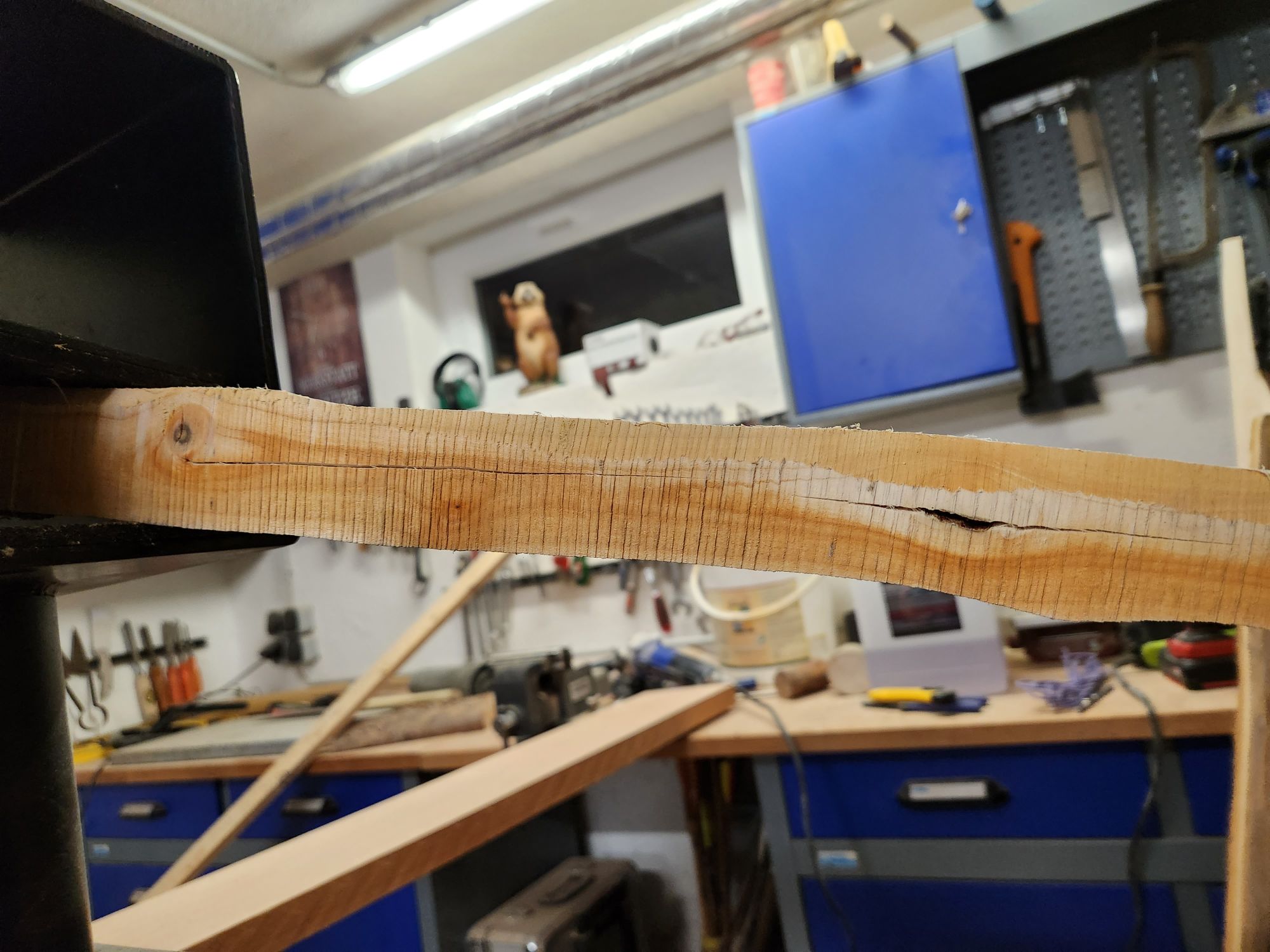 Ich hab jetzt beschlossen die Sehnenlage weiter zu verbessern und hab deshalb gestern nochmal Griffnahe gebogen und heute kommt dann die andere Seite dran. Dabei sind mir auch tiefe Trocknungsrisse aufgefallen. Bislang aber nur Bauchseitig.