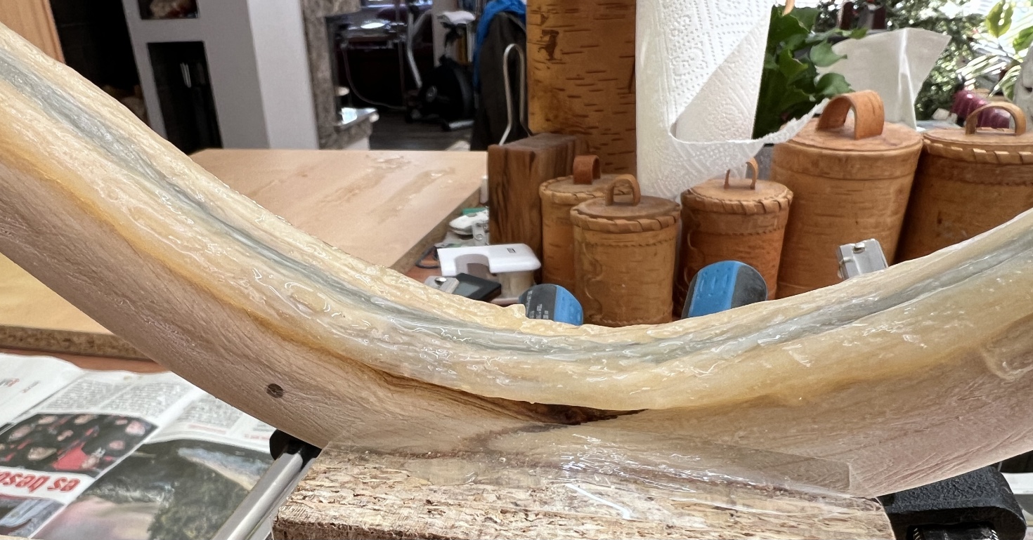 Über Nacht habe ich den Bogen eingespannt um etwas Reflex rauszunehmen. Heute dann die Sehnen Session. 3 Sehnen sind mir gelungen aufzutrennen ohne die die Kontinuität zu zerstören. Einweichen der Sehnen in lauwarmes Wasser unter Zusatz von 2 Tropfen Spülmittel. Über Nacht habe ich schon Hautleim quellen lassen und dann im Leimkocher auf 55 Grad erwärmt. Im Leimtopf sind 2 Kammern, eine für dünnflüssigen Leim, eine für zähflüssigen. Der Bogen bleibt während dem Sehnenbelegen eingespannt. Zuerst Reinigung mit Aceton. Dann mit heißem Wasser bestreichen und trocknen lassen, damit sich die Fasern aufstellen. Fühlt sich nach dem Trocknen deutlich rauer an. Dann 3x Einstreichen mit dünnflüssigem Leim und zwischen jedem Anstrich mit dem Haarföhn erwärmen damit er besser einzieht. Die eingeweichten Sehnen mit Wasser sauber Spülen, dann wird die erste Sehne in den zähflüssigen Hautleim gelegt. Mit der Spitze eines Essstäbchens werden dabei die Fasern auseinander gedrängt, damit der Leim in alle Ecken kommt. Nach fünf Minuten wird die Sehne herausgenommen, überschüssiger Leim vorsichtig ausgestrichen. Die Sehne wird auf einem glatten Brett flach gestrichen, dann mit einem Messer abgehoben und die Sehnenplatte jetzt dem Wurfarm aufgelegt, mit dem Finger flach streichen und Lufteinschlüsse rausmassieren. Die beiden weiteren Sehnen werden in gleicher Weise aufgebracht, die 10 Zentimeter langen Überlappungen befinden sich genau im Spleißbereich der beiden Bogenknie. Die Ränder sehen wulstig aus. Wie immer siehts nicht perfekt aus. Wickeln mit breitem Hosengummei hin und zurück (gegengleich damit sich nichts verdreht). Im eingespannten Zustand gehts jetzt ab in die Sauna, 55 Grad 1 Stunde. Dann 1 Stunde abkühlen lassen und Auswickeln. Jetzt siehts deutlich besser aus, die Randbereiche der Sehne sind glatt auslaufend, in der Mitte ist der Sehnenbelag am dicksten. Sieht jetzt eigentlich richtig gut aus. Jetzt über Nacht trocknen lassen, dann wird der Bogen wieder eingespannt. Der Bogen wiegt jetzt 442 Gramm. LG Stephan