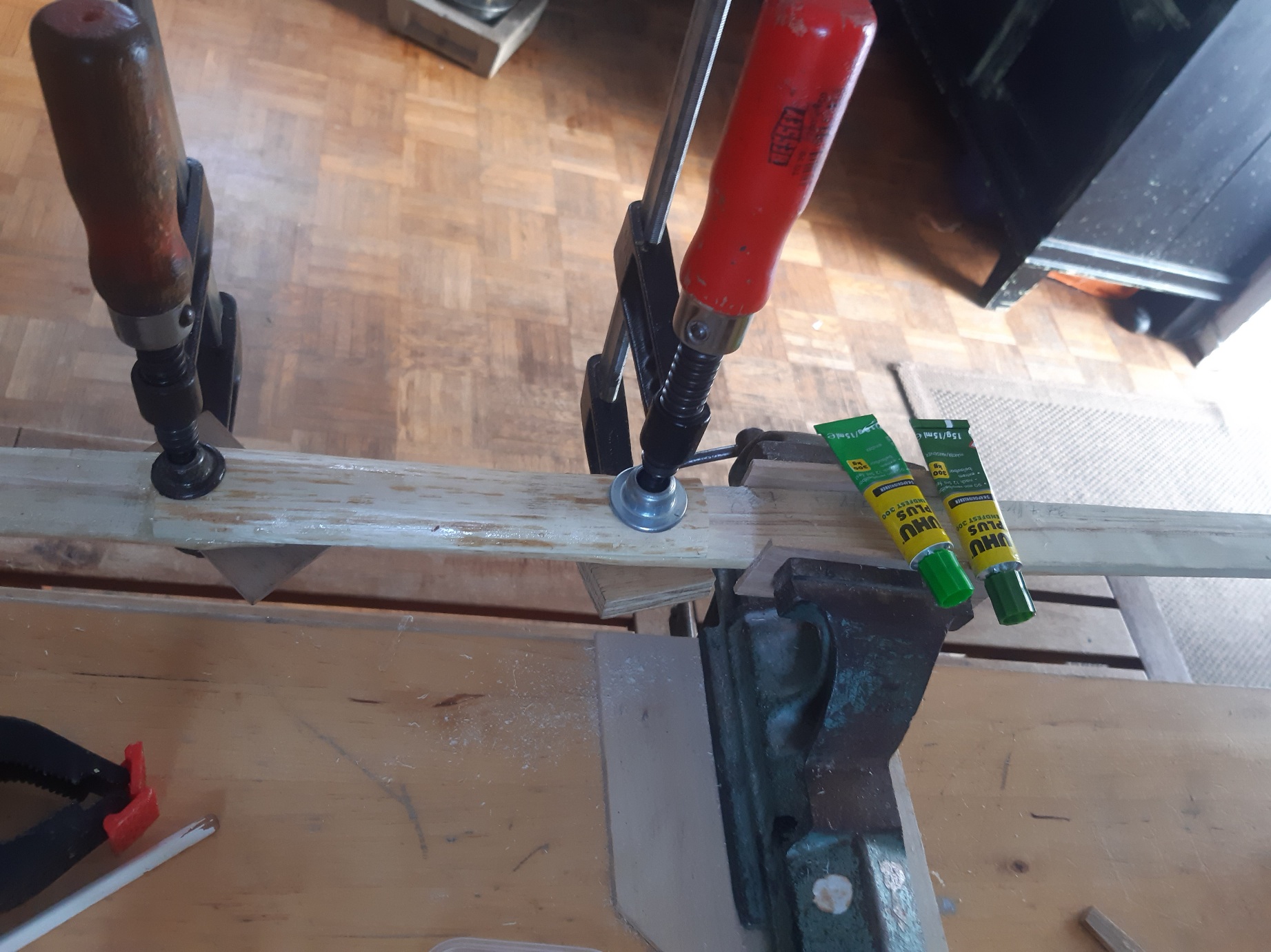 Bin die Woche leider nicht zum schreiben gekommen. Am Sonntag habe ich noch schnell, schnell am Rücken den Spleiß überklebt. Und wieder gemerkt das schnell sch... ist. Schon beim ausspannen den Rohling mitsamt Schraubzwingen auf Schraubstock und Werkzeug fallen lassen also eine Macke im Rücken. Habe trotzdem noch am Rücken was draufgeklebt, natürlich länger als ich eigentlich wollte, weil schnell, schnell. ::) Am Dienstag und am Donnerstag die Sehnenlage mit Dampf korrigiert.