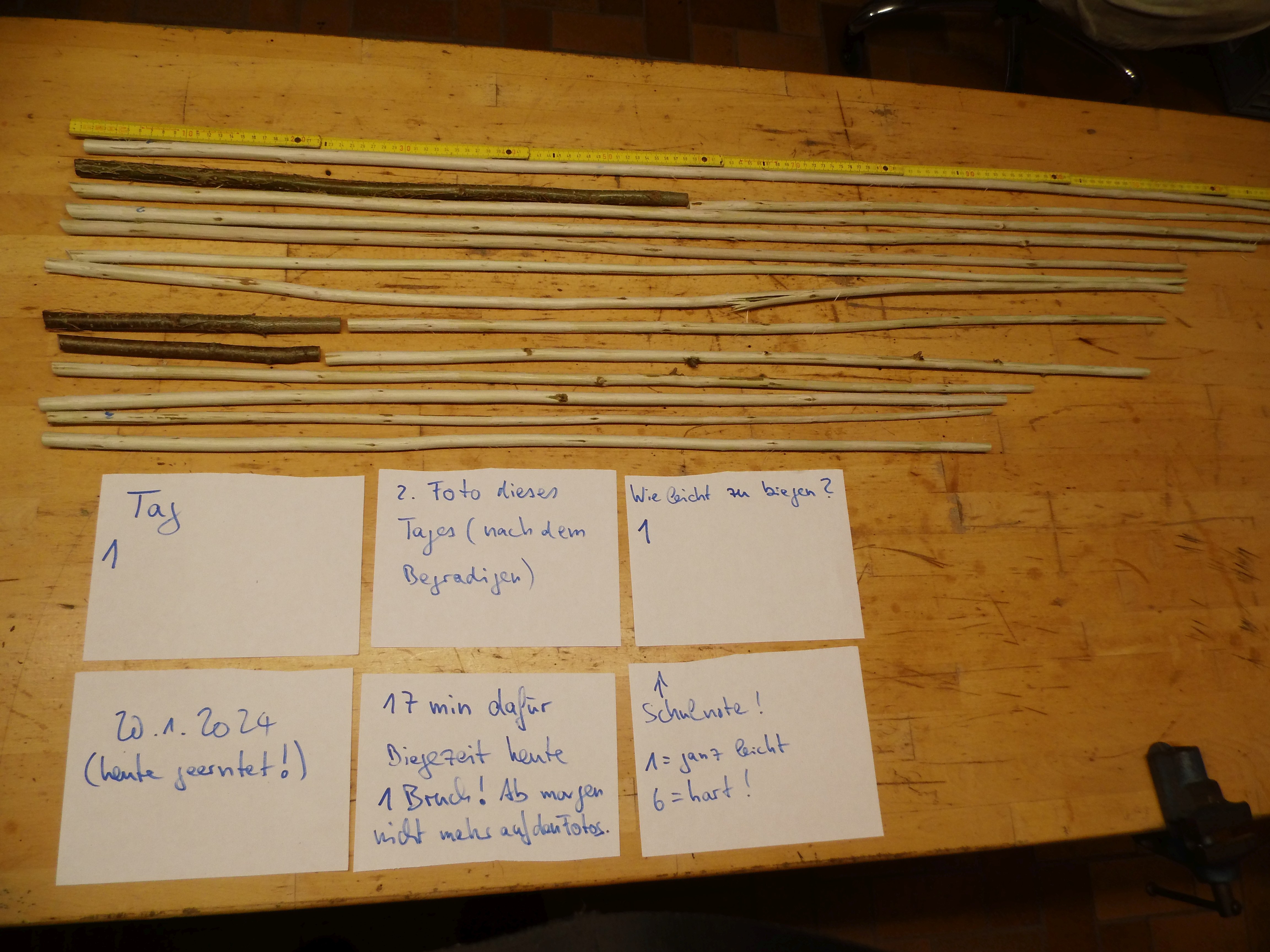 Mein Vorgehen sieht wie folgt aus: Die Äste werden jeden Tag vor der Bearbeitung fotografiert, dann gebogen (dabei wird die Zeit gemessen) und dann wieder fotografiert. Dabei werden Beobachtungen notiert. Weiter habe ich 3 Äste mit Edding markiert. Einmal am Ende, einmal mittig, aber eher Richtung dickes Ende und einmal am dünnen Ende. Genau dort messe ich täglich den Durchmesser und notiere ihn.