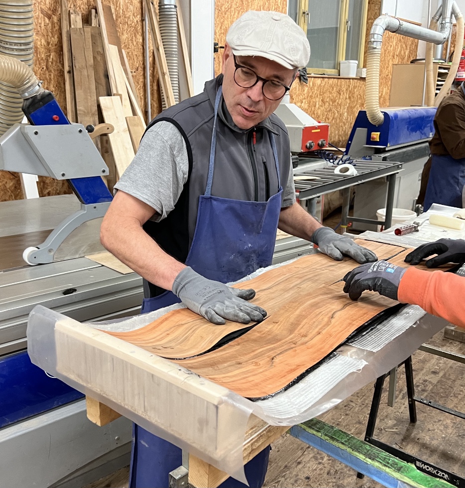 Heute einmal nicht Bogen gebaut, dafür was ganz anderes gemacht. Eine Tischlerei bei uns bietet Skibaukurse an und ich nehme jetzt 2 Tage an diesem Kurs teil. Baue mir einen Snowlynx, das ist ein Tiefschnee Kurzschi, 109cm lang und 15cm bis 17cm breit. Heute alles laminiert, 11 Schichten, das Deckfurnier ist ein schöner Apfelbaum. Das ganze wird jetzt über Nacht Vakuum verpresst und morgen wird weiter gearbeitet.