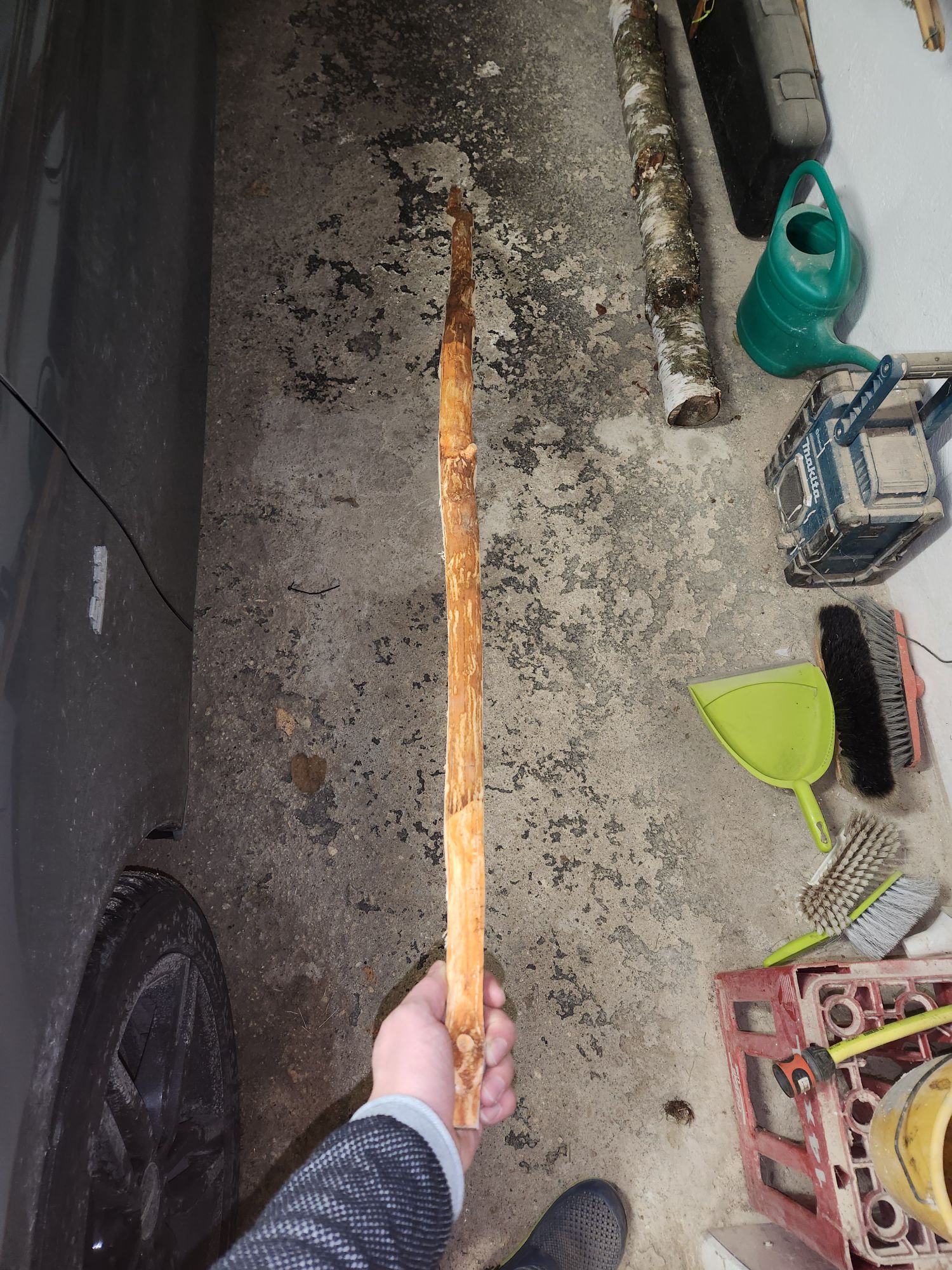 In 3 Tagen im beheizten Wohnraum hat er 33g verloren. Gestern hab ich ihn dann mal auf nahezu fertige Breite gebracht (mit Hufraspel und Halbrundraspel). Und heute hab ich die Risse mit Endfest 300 gefüllt.