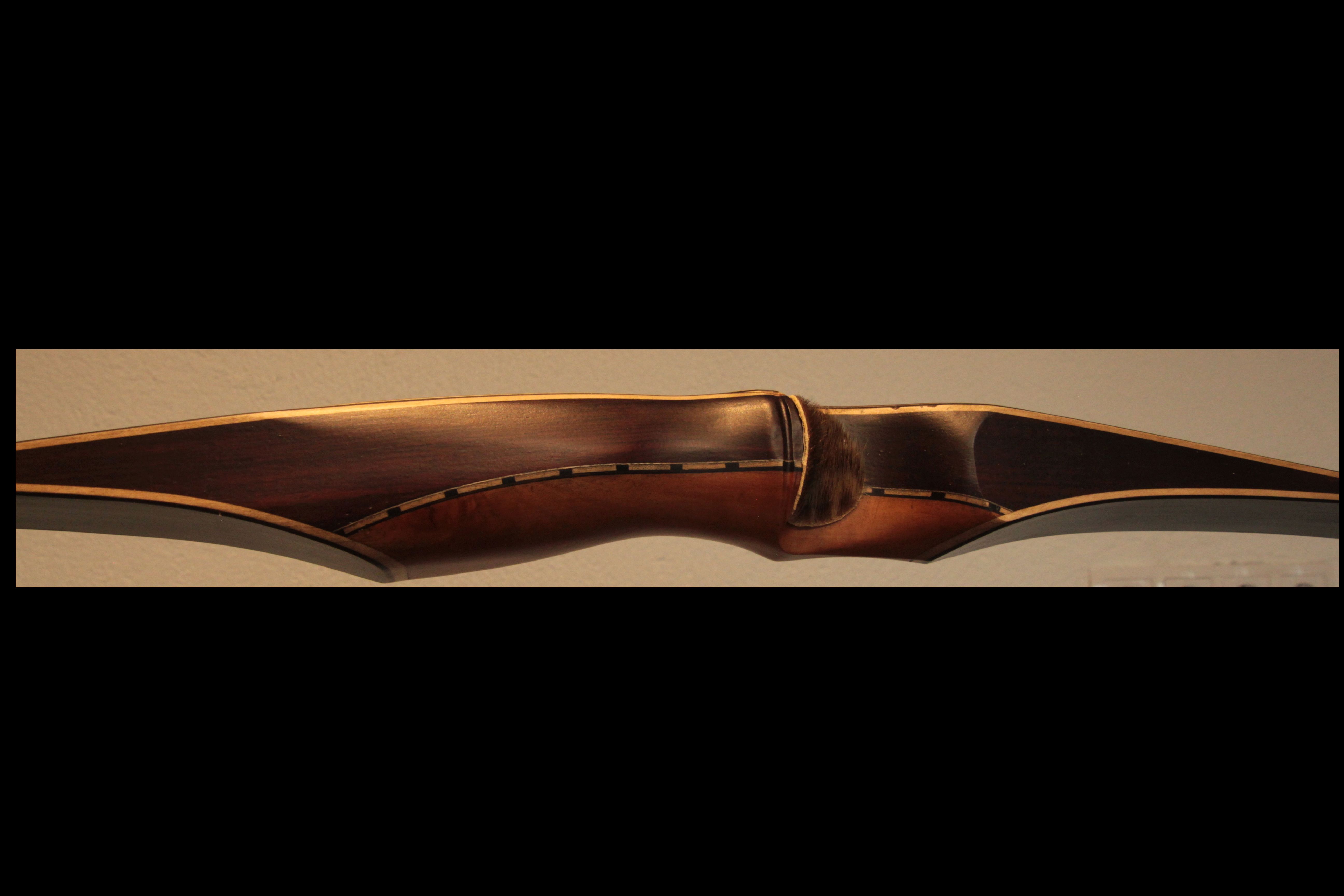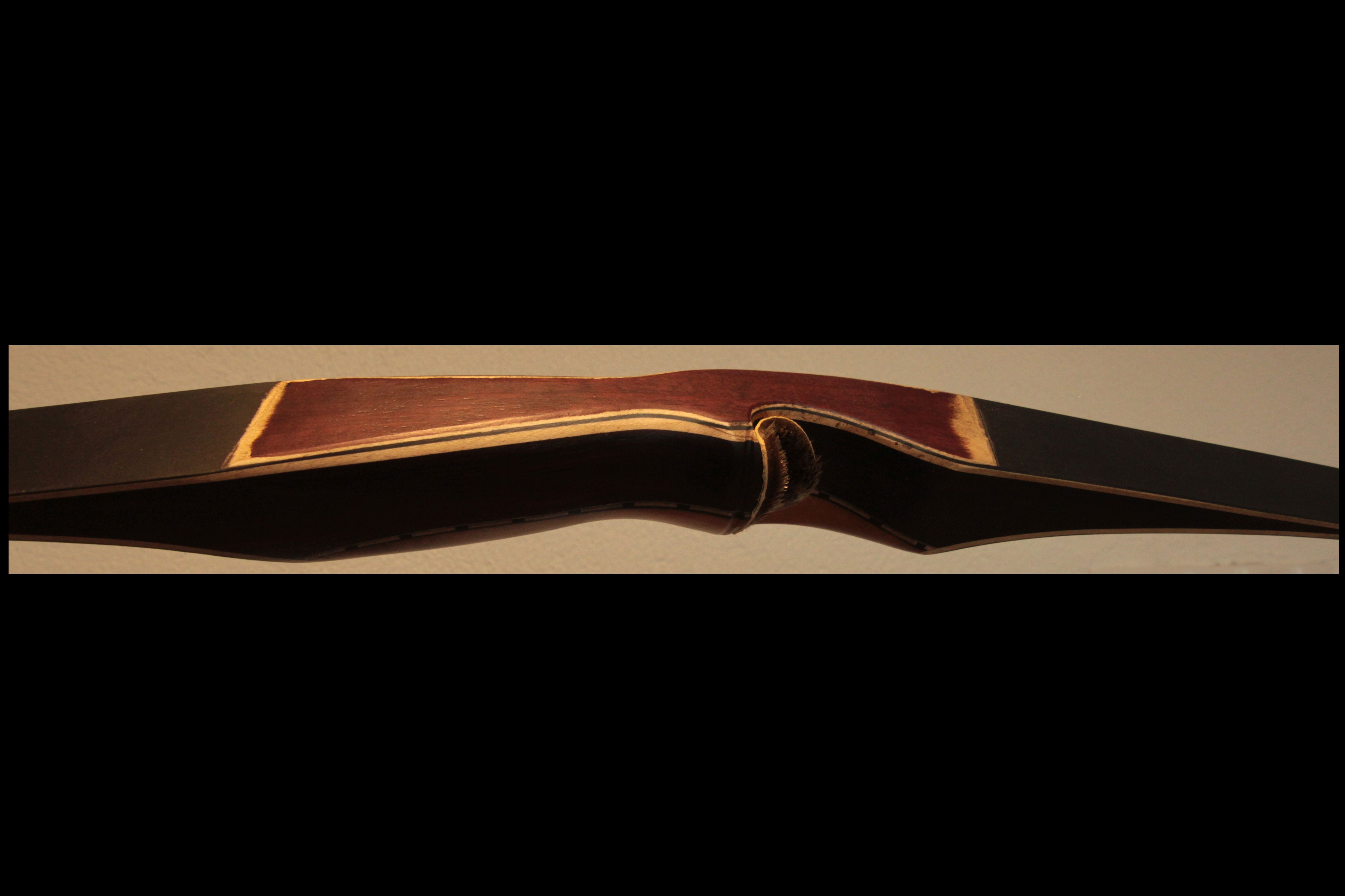 Der Griff ist aus Veilchenholz mit Birne und die Tips wieder aus schwarzem Büffelhorn mit roter Einlage. War gedacht als leichter Bogen und hatte entsprechend der Auslegung 26"@28". Am oberen WA muss ich noch etwas wegnehmen, damit er sich gleichmäßiger oben und unten biegt, dann bleiben wahrscheinlich noch 25lbs übrig. Ein wunderbarer Bogen fürs Wohnzimer Schießen aber auch auf dem Parcour kommt man gut zum 60m entfernten Büffel