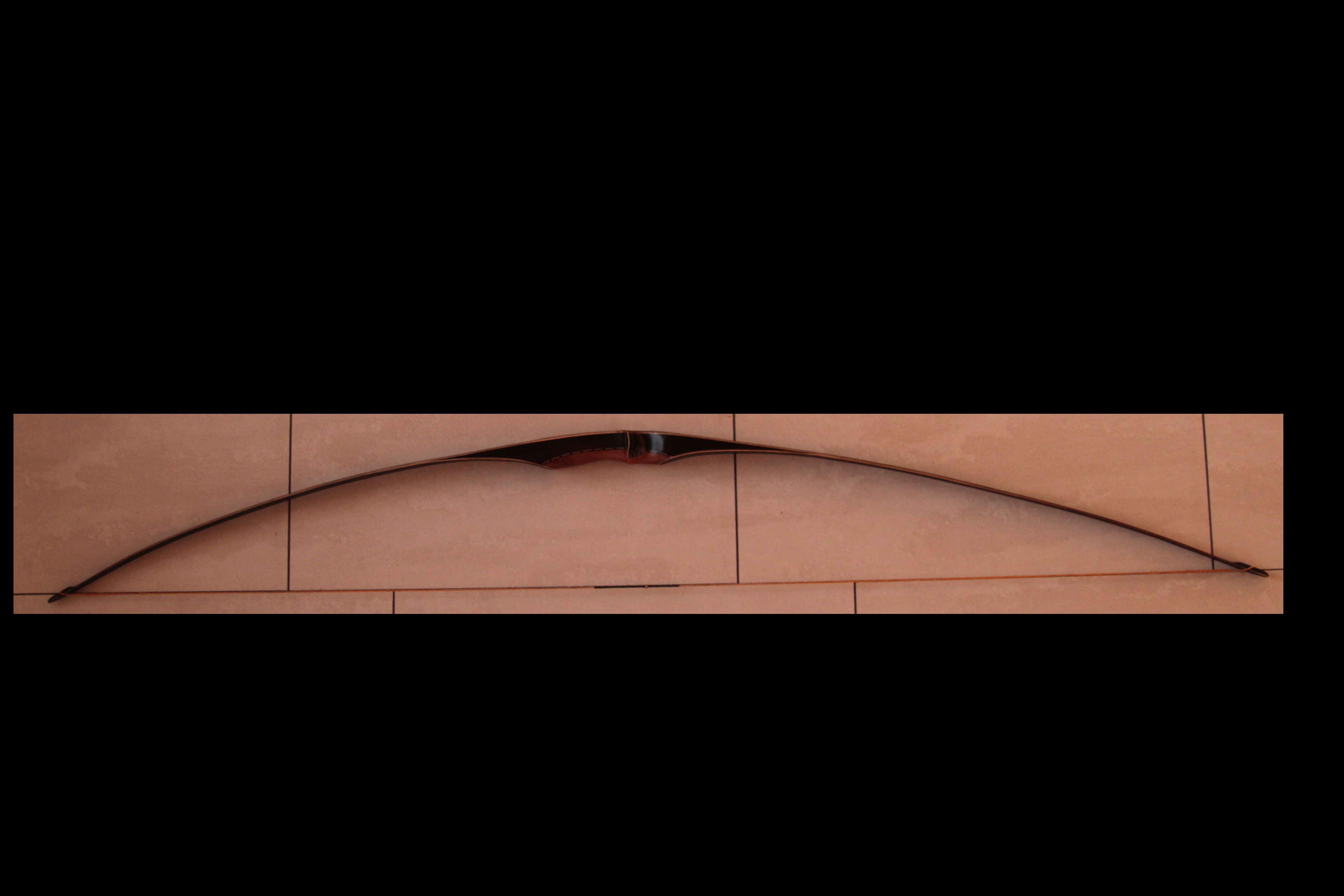 Der Griff ist aus Veilchenholz mit Birne und die Tips wieder aus schwarzem Büffelhorn mit roter Einlage. War gedacht als leichter Bogen und hatte entsprechend der Auslegung 26"@28". Am oberen WA muss ich noch etwas wegnehmen, damit er sich gleichmäßiger oben und unten biegt, dann bleiben wahrscheinlich noch 25lbs übrig. Ein wunderbarer Bogen fürs Wohnzimer Schießen aber auch auf dem Parcour kommt man gut zum 60m entfernten Büffel