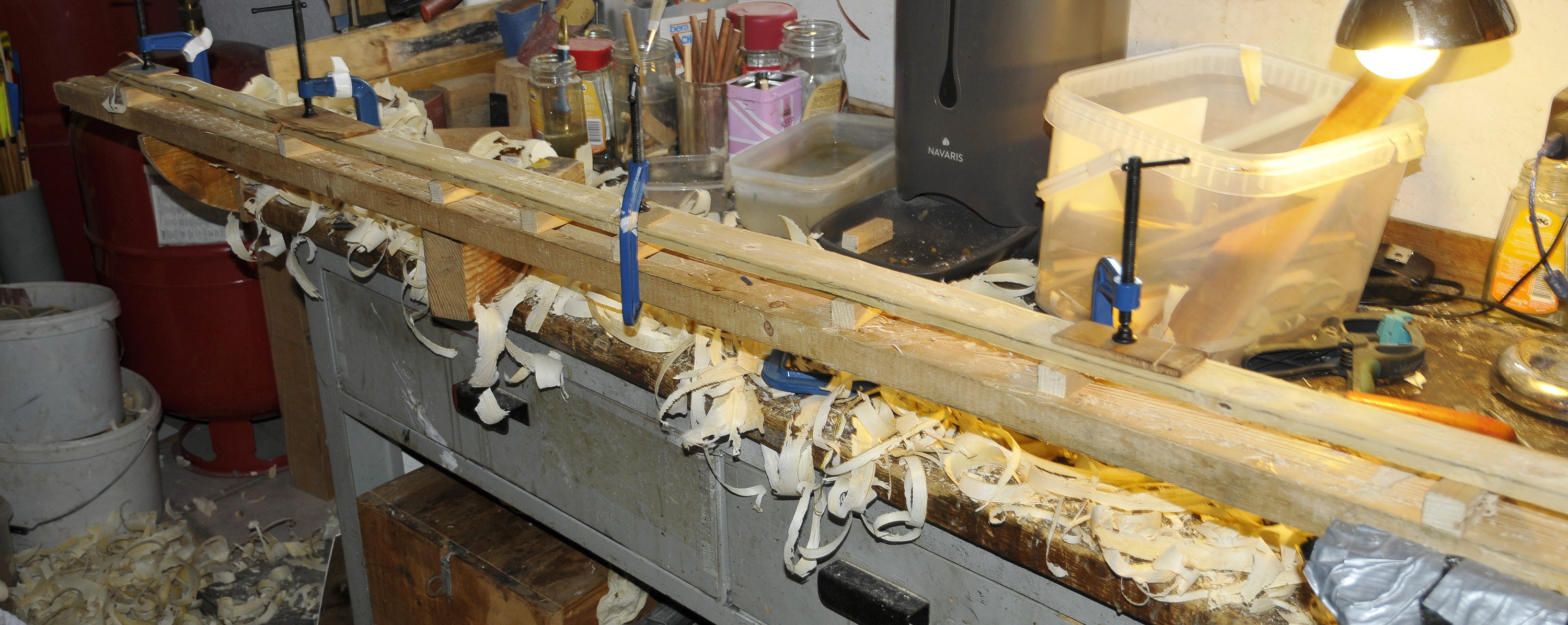 Das Hasellaminat ist trocken, das Traubenkirschenlaminat hab ich noch etwas getapert (9mm auf 5mm) und dann noch etwas mit der HLP behandelt. Da kann ich nächste Woche bereits Hasel und Traubenkirsche zusammenkleben, die Enden möchte ich vorher noch etwas flippen. Ziel ist ein stabförmiger Bogen mit moderaten Zuggewicht, so in etwa nach den Viktorianischen Langbögen.