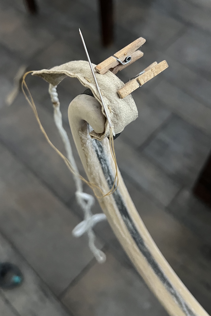 Dann habe ich gestern noch meine Rohhautsehne umgebaut. Ein Ende in Wasser aufgeweicht. Dann aufgequirlt, ein neues Öhrchen gebildet und den Rest verspleißt. Die Sehne aufgehängt, eingedreht und ein Gewicht angehängt. Heute die getrocknete Sehne im Bereich der Enden noch mit hirngegerbtem Hirschleder ummantelt. Ziemlich originalgetreu. Ein Sehnenduplikat aus Dacron B 55 habe ich ebenfalls angefertigt.