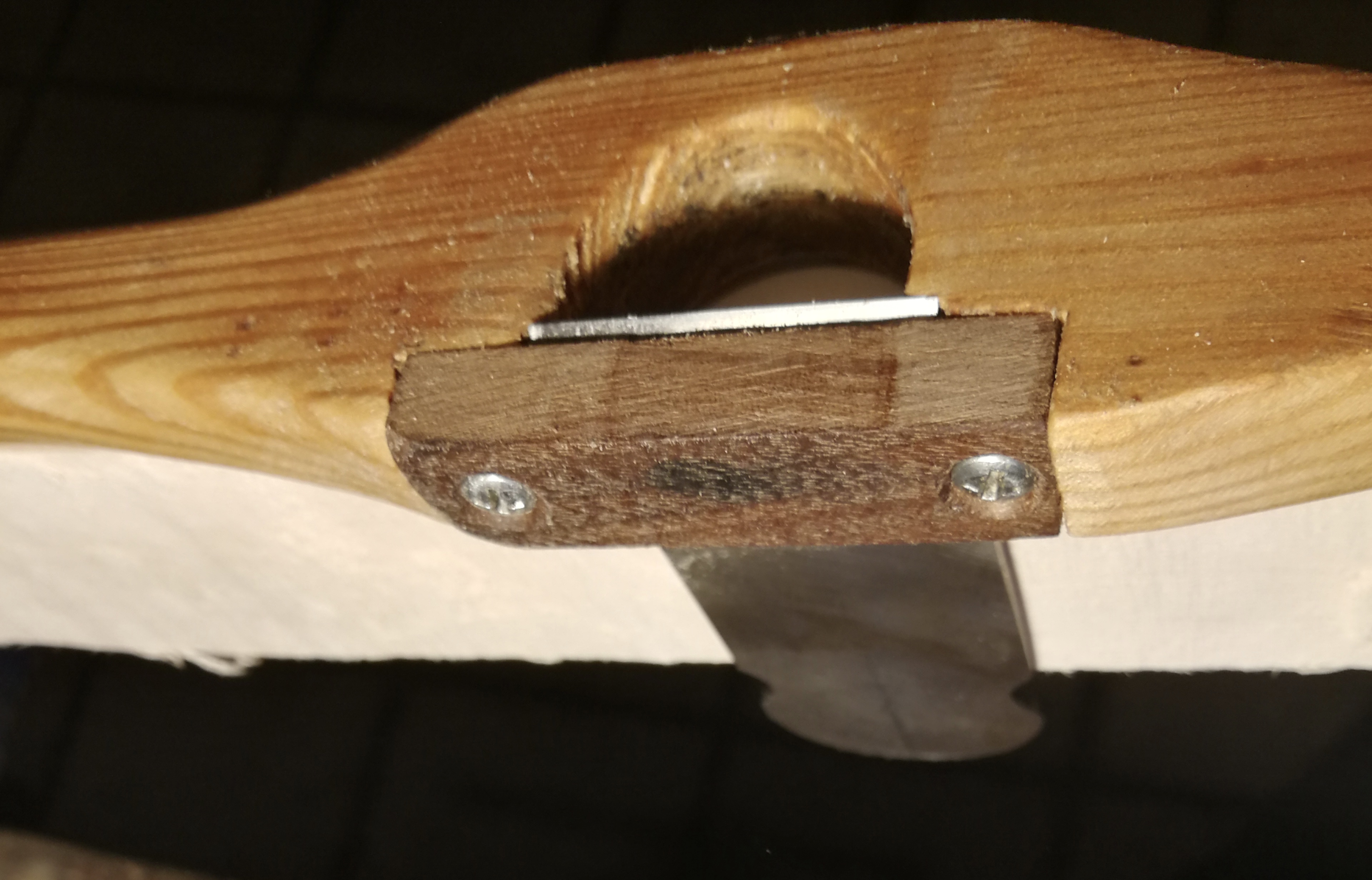 Ich hab es nun schnell nachgebaut, Holz aus einer Terrassendiele und die Klinge von einem billigen Einhandhobel.