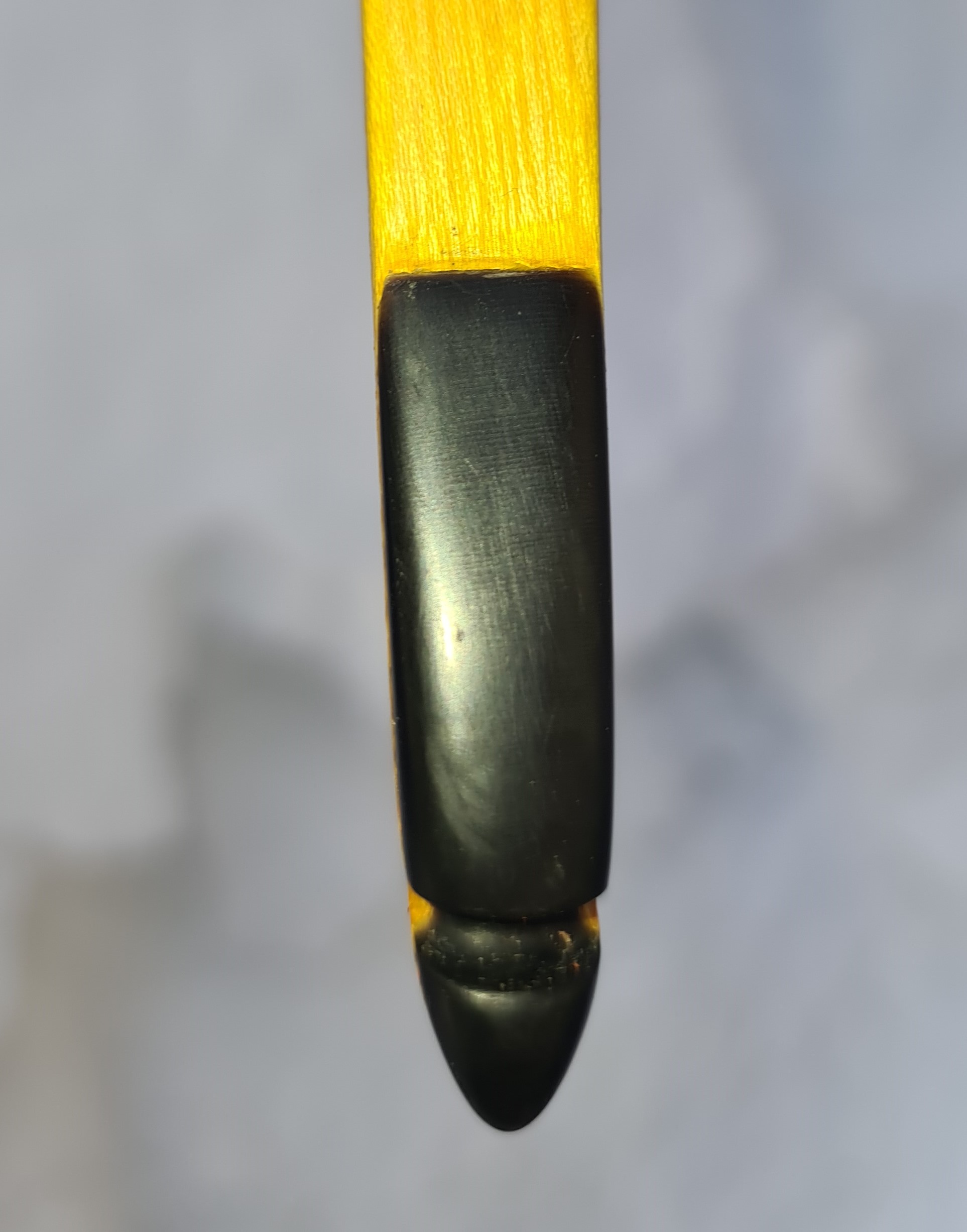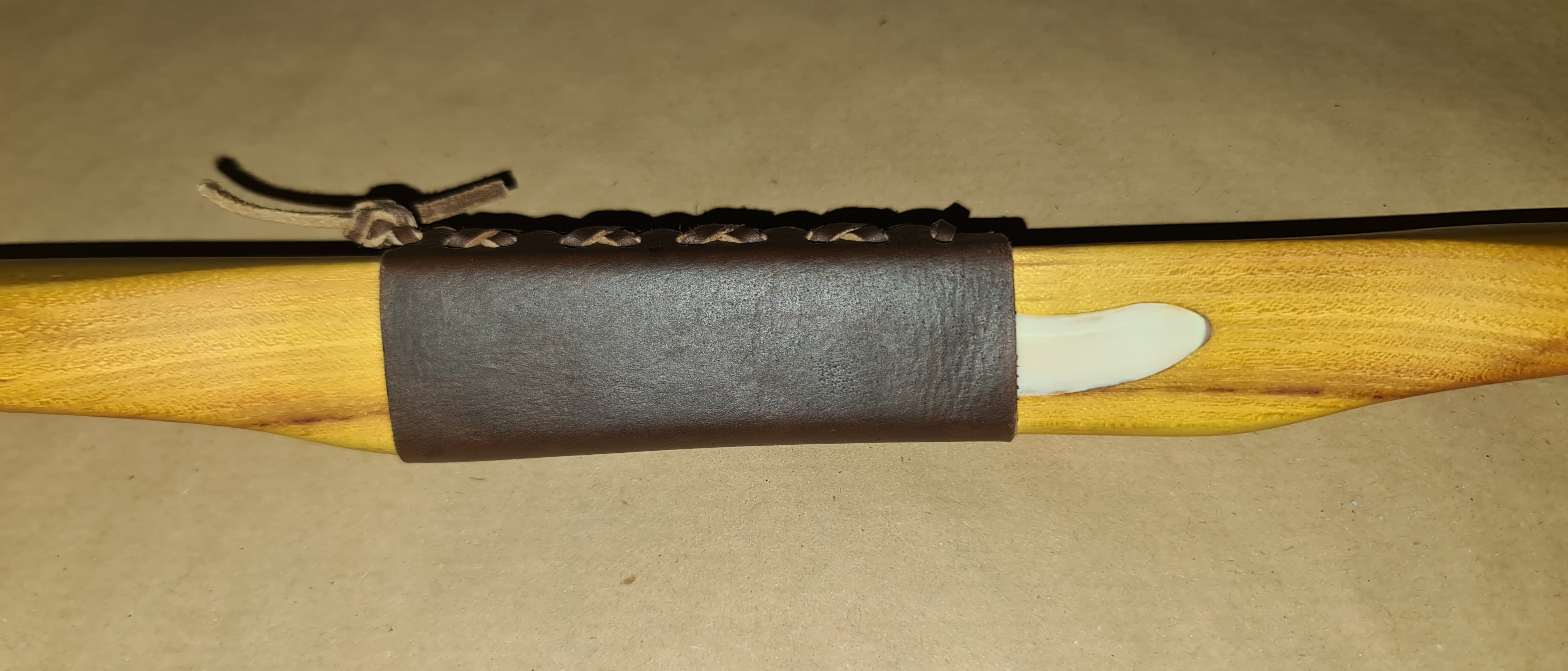 Materialien: Overlays aus Horn, Griffleder vom Rind, Pfeilanlage Hauer vom Schwarzkittel, Sehne 14-Strang Dacron B50 (flämisch gespleisst)