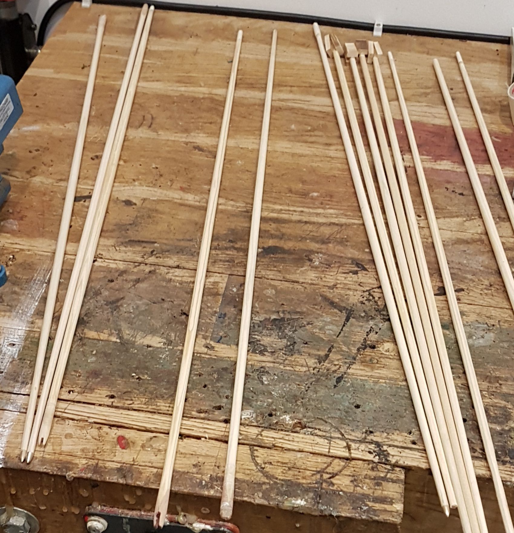 Das sind meine Patienten, ein Osage Bogen 136cm, der stave war ziemlich krumm, 8x Wärmebehandlung um ihn in Form zu bringen, Pfund weiß ich noch nicht, bisher nicht auf Maximalauszug gezogen und geschossen. 1 Osage Bambus Langbogen, vielleicht wird der Vorort noch gekürzt, schauma was die Weitschussprofi sagen und ein englischer Langbogen, damit diese Klasse auch bedient wird. Dann noch moderne Osmanische Kompositbögen außer Konkurenz. Pfeile habe ich von 6,6Gramm bis 17 Gramm gebaut, insgesamt 23, nachdem ich 2x geschossen habe und keine mehr gefunden habe, habe ich ein paar mehr gebaut.wann trefft Ihr am Donnerstag ein? LG Stephan