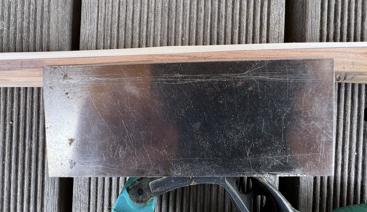 Ich kann nicht schlangenartig die Form der Zwetschke auf den Hasel pausen. Ich habe eine Mittellinie entsprechend der Maserung auf das Hasellaminat gezeichnet und mit der Schablone nur den Breitentaper übernommen. Auch die seitlichen Verwindungen wurde dem Hasellaminat beim Kleben aufgezwungen. LG Stephan