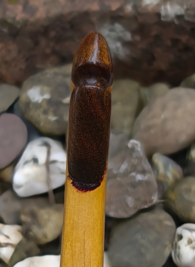 Ausgangsmaterial war ein im Februar geernteter Sapling aus Hasel mit einem Durchmesser unten/oben von 8/6 cm.