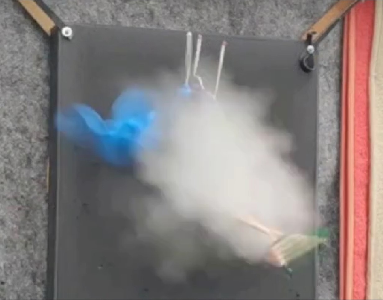 Ich habe es dann mit Rauchmeldertestspray versucht (was eher ein Aerosol ist). Das ging ganz gut in den Luftballon hineinzubringen, aber es gab keinen optischen Effekt. Nichts, Null.