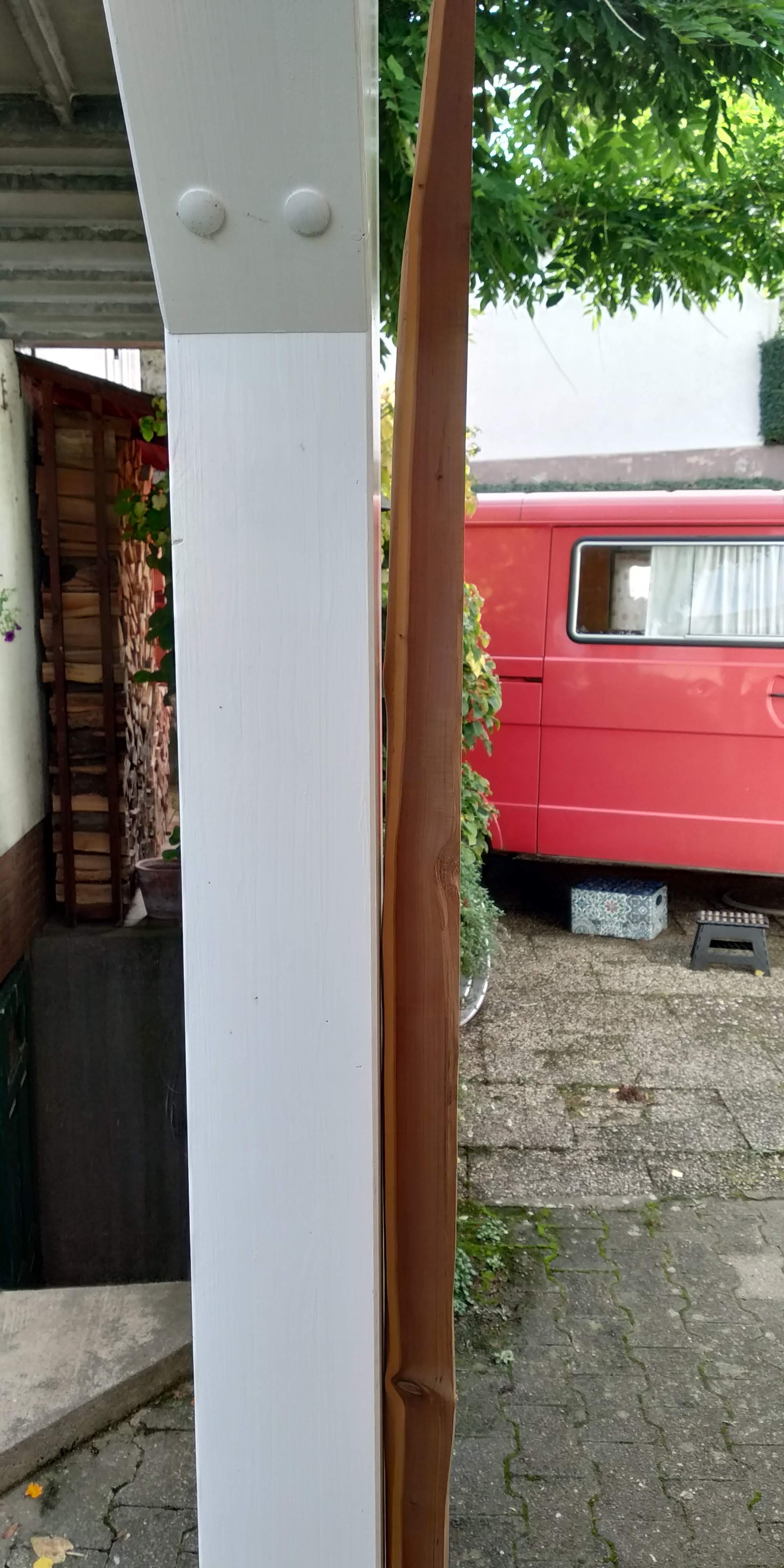 Um den Deflex zu zeigen, hab ich den Bogen mit seinem Mittelstück an einen Holzbalken gestellt. Es sind oben wie unten etwa 25-30mm.