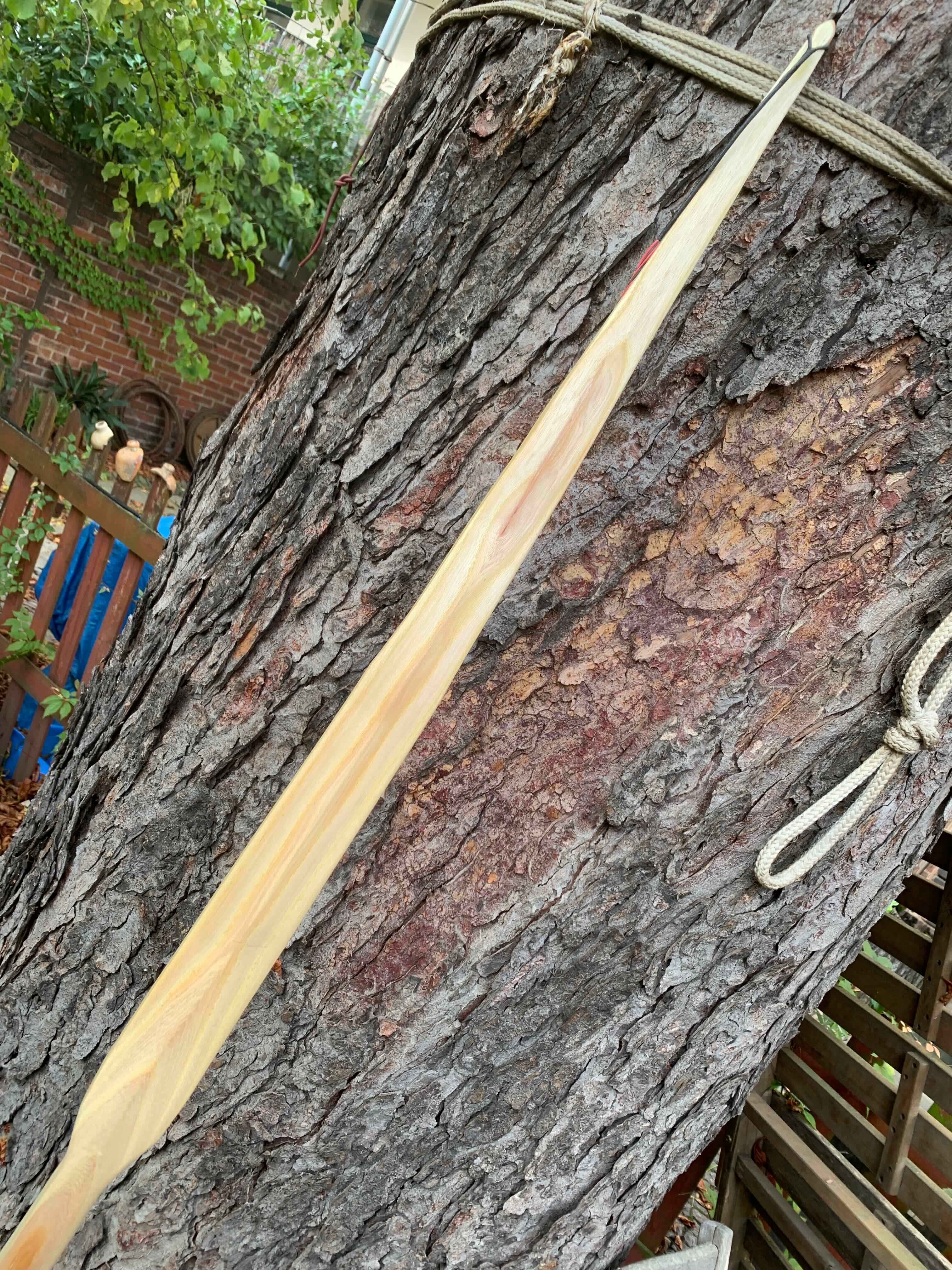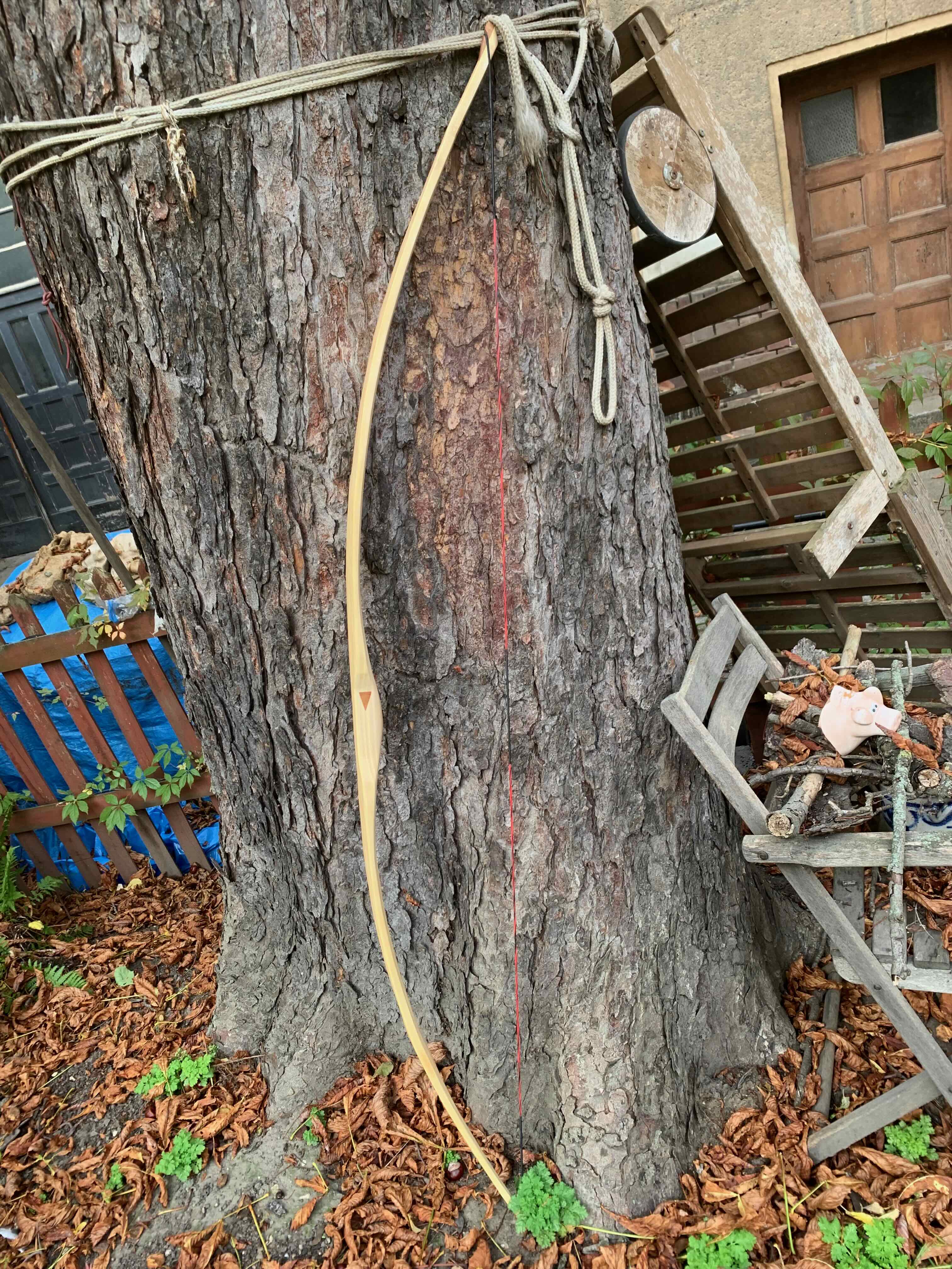 Den Bogen nicht im Vollauszug auf dem Tillerbrett lassen, auch nicht für's Foto. Bau dir lieber was mit Seil und Umlenkrolle, sonst generierst du dir bleibende Schäden beim Tillern schon.