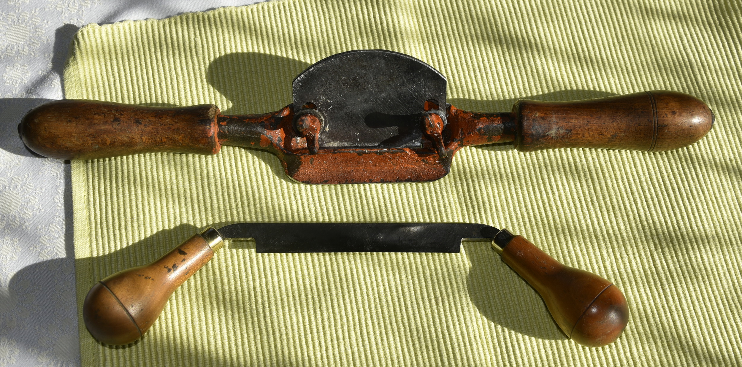 Also Schweifhobel. Ich hab zwei von denen von Lie-Nielsen in Gebrauch, Bronzegehäuse, Holzgriffe, bei einem ist die Sohle plan, bei dem anderen in Arbeitsrichtung konvex, so dass man geschweifte Innenradien bearbeiten kann. Ich finde, es sind sehr unterschätzte Werkzeuge mit einem riesigen Einsatzsprektrum, eigentlich habe ich die, wenn ich gerade Holzsachen mache, andauernd in der Hand. Ob man gerade eine Kante anphasen will oder vom Stirnholz zehntelweise abtragen will, die Dinger gehen fast immer. Durch die Breite des Griffs kann man sehr genau arbeiten. Ich kann die nur empfehlen. Bei den Nielsens zahlt sich obendrein das moderne Eisen aus, das echt starke Standzeiten aufweist, selbst wenn man Multiplex und harte Hölzer bearbeitet. Ursprünglich waren das mit die wichtigsten Werkzeuge, um Holzspeichen und Radreifen handgemachter Kutschen- und Karrenräder anzufertigen, dort sind sie nicht wegzudenkende Werkzeuge gewesen. Die Innenradien der Felgensegmente haben dabei die konvex geformte Sohle erforderlich gemacht, aber auch die Speichen haben konkave Formen gehabt.