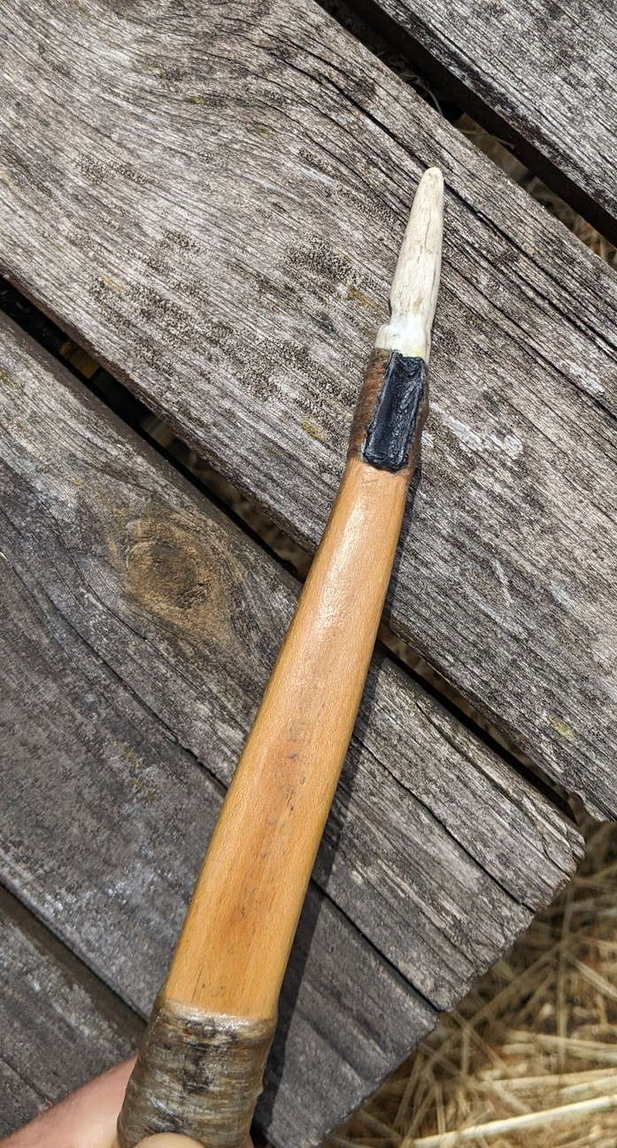 Geweih mit einem konischen Bohrer aufgebohrt, Holz angespitz und mit epoxy geklebt.