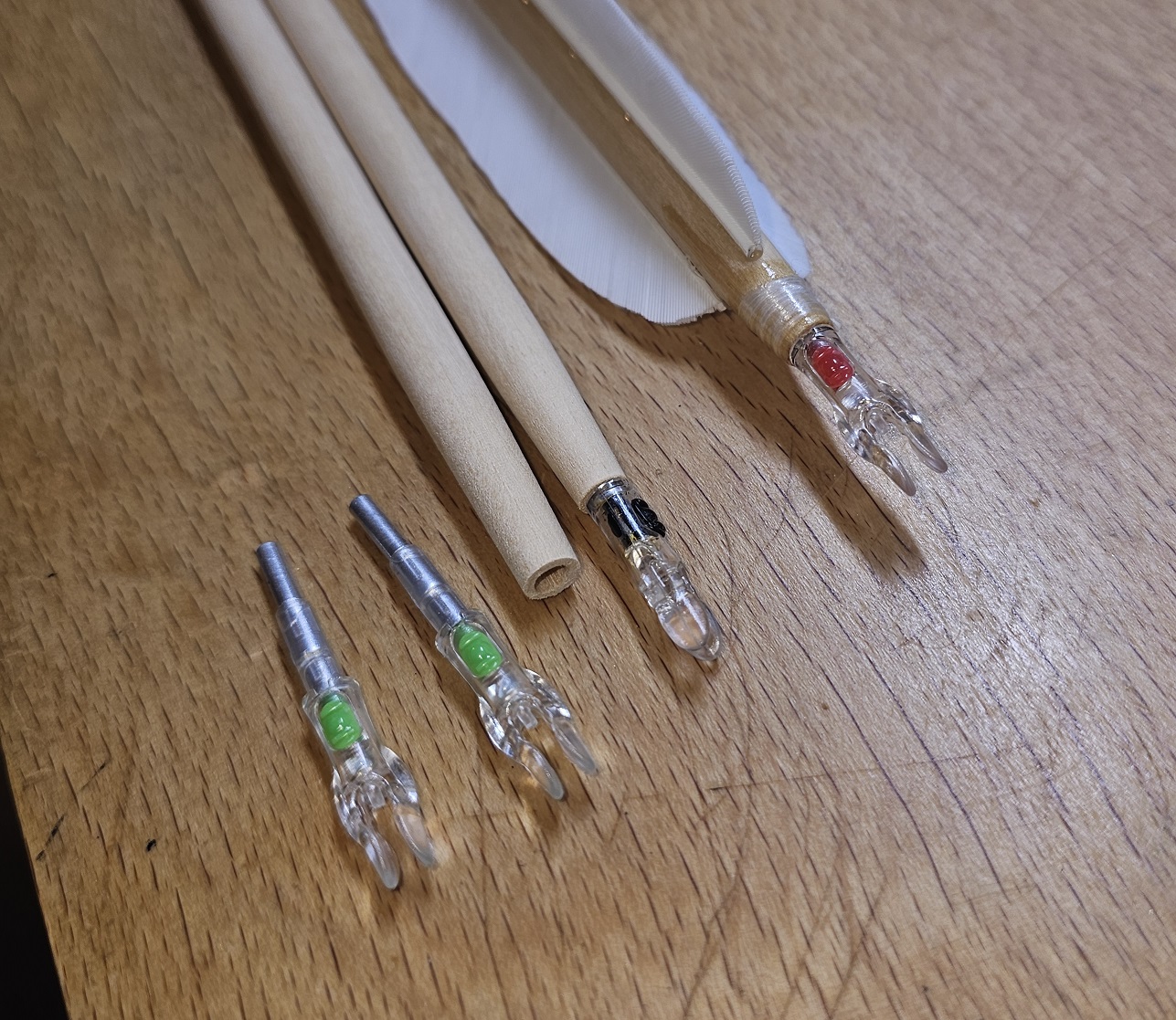 Da ich das für ein Nachtturnier ausprobieren wollte hab ich mir ein paar davon bestellt (Lieferzeit ca. 8 Tage) und ein paar passende Holzschäfte aus dem Bestand rausgesucht: