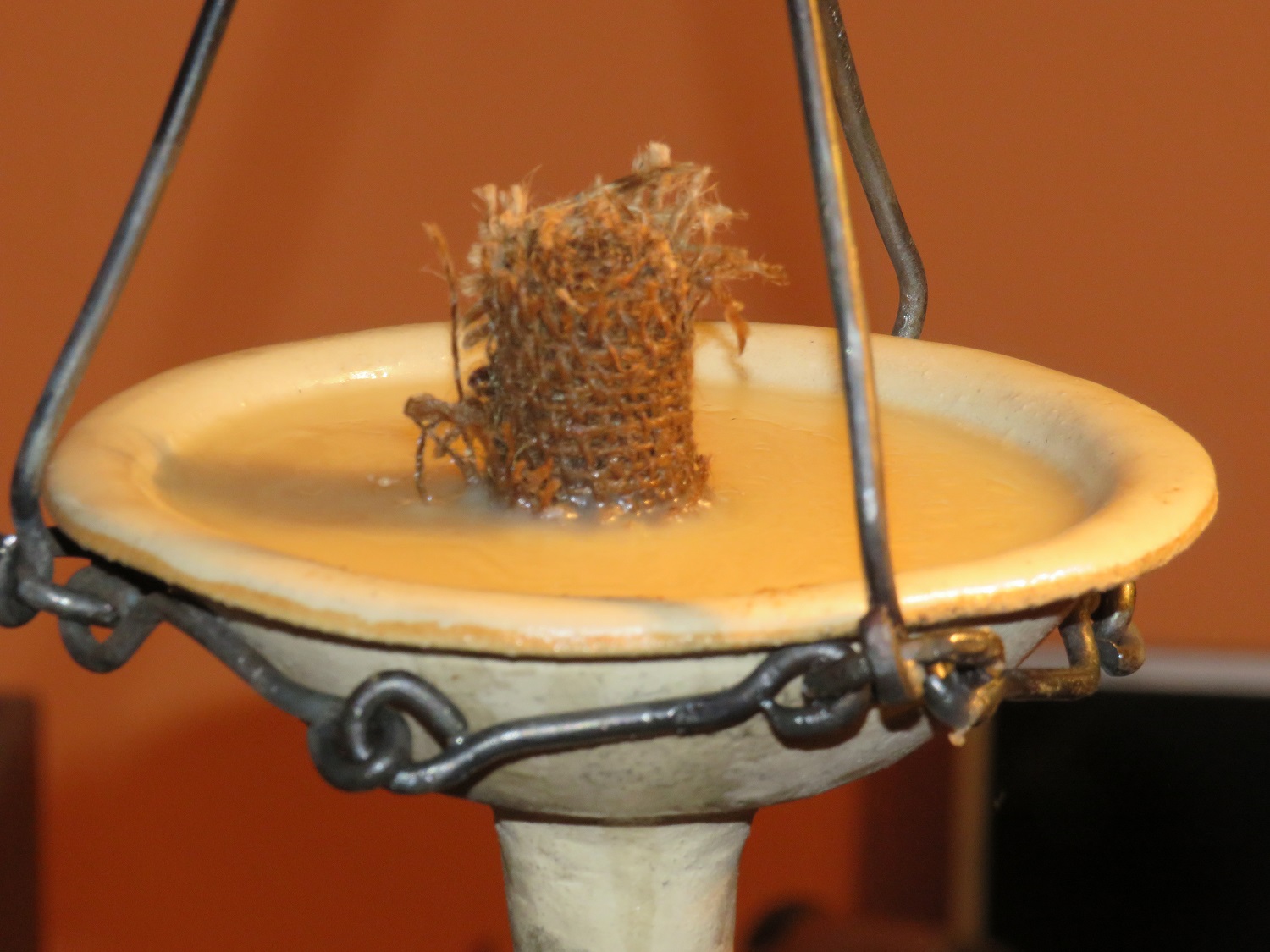 Ich habe eine ähnliche Talglampe. Und eine andere Variante, die nan auf den Tisch stellen kann, die auch so einen "Zipfel" hat, nur nach oben. Der Zipfel ist zum Tragen gedacht