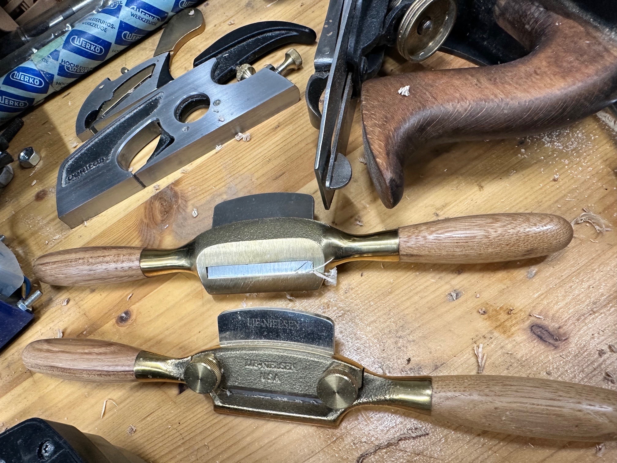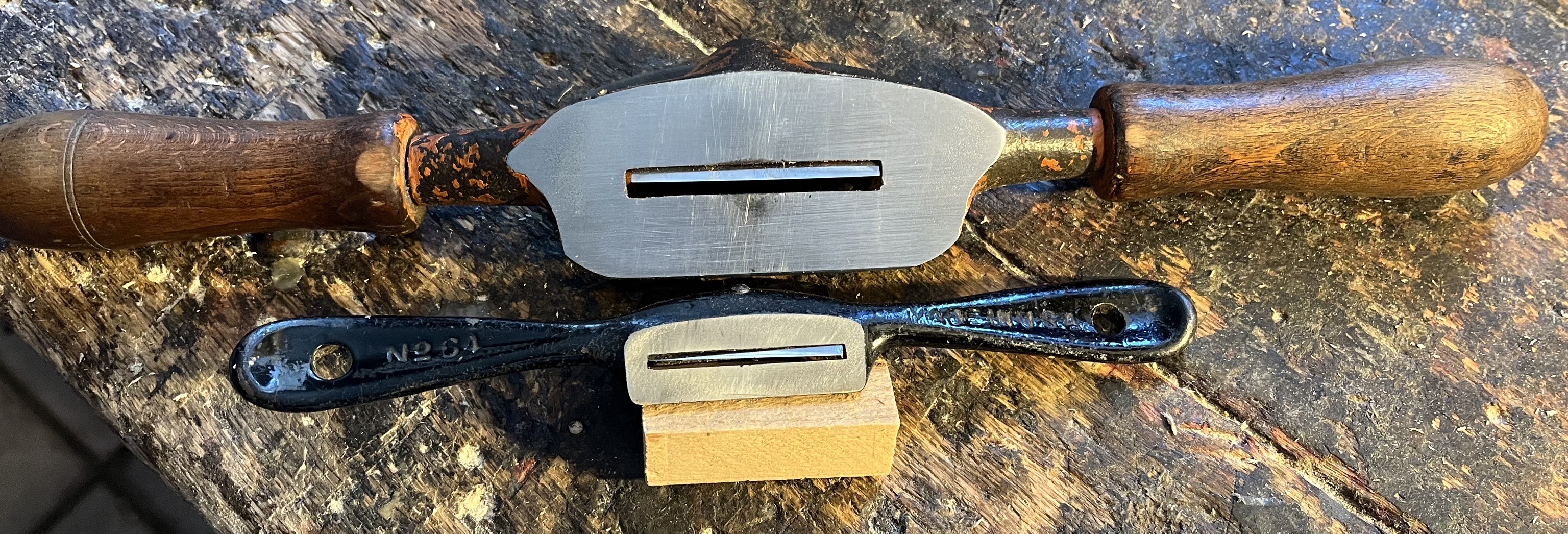 Also Schweifhobel. Ich hab zwei von denen von Lie-Nielsen in Gebrauch, Bronzegehäuse, Holzgriffe, bei einem ist die Sohle plan, bei dem anderen in Arbeitsrichtung konvex, so dass man geschweifte Innenradien bearbeiten kann. Ich finde, es sind sehr unterschätzte Werkzeuge mit einem riesigen Einsatzsprektrum, eigentlich habe ich die, wenn ich gerade Holzsachen mache, andauernd in der Hand. Ob man gerade eine Kante anphasen will oder vom Stirnholz zehntelweise abtragen will, die Dinger gehen fast immer. Durch die Breite des Griffs kann man sehr genau arbeiten. Ich kann die nur empfehlen. Bei den Nielsens zahlt sich obendrein das moderne Eisen aus, das echt starke Standzeiten aufweist, selbst wenn man Multiplex und harte Hölzer bearbeitet. Ursprünglich waren das mit die wichtigsten Werkzeuge, um Holzspeichen und Radreifen handgemachter Kutschen- und Karrenräder anzufertigen, dort sind sie nicht wegzudenkende Werkzeuge gewesen. Die Innenradien der Felgensegmente haben dabei die konvex geformte Sohle erforderlich gemacht, aber auch die Speichen haben konkave Formen gehabt.