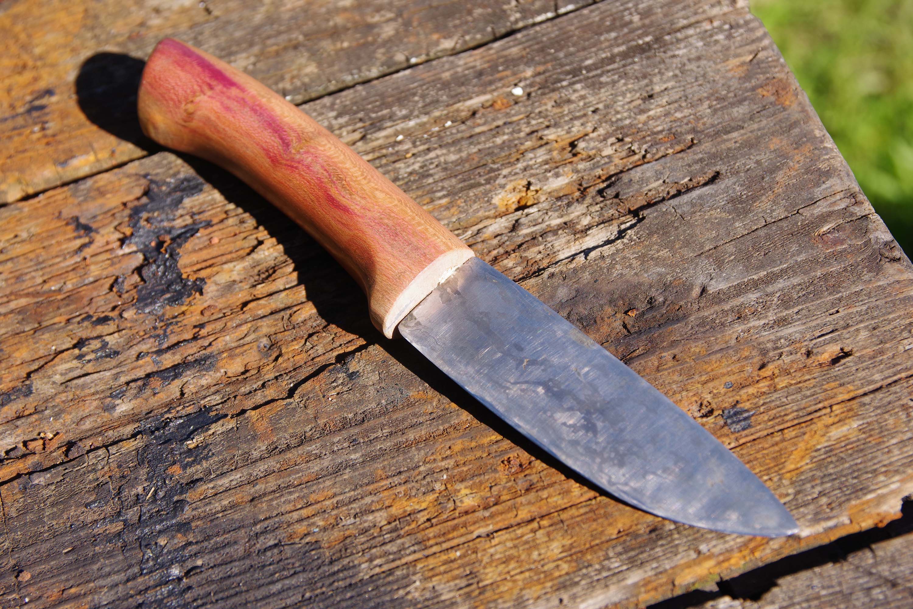 Die Klinge habe ich in ein vorgebohrtes Loch in den Griff gesteckt und weiches Holz (bin mir unsicher welches) in die Lücken gestopft, bis es hielt. Und das tut es überraschenderweise noch immer.