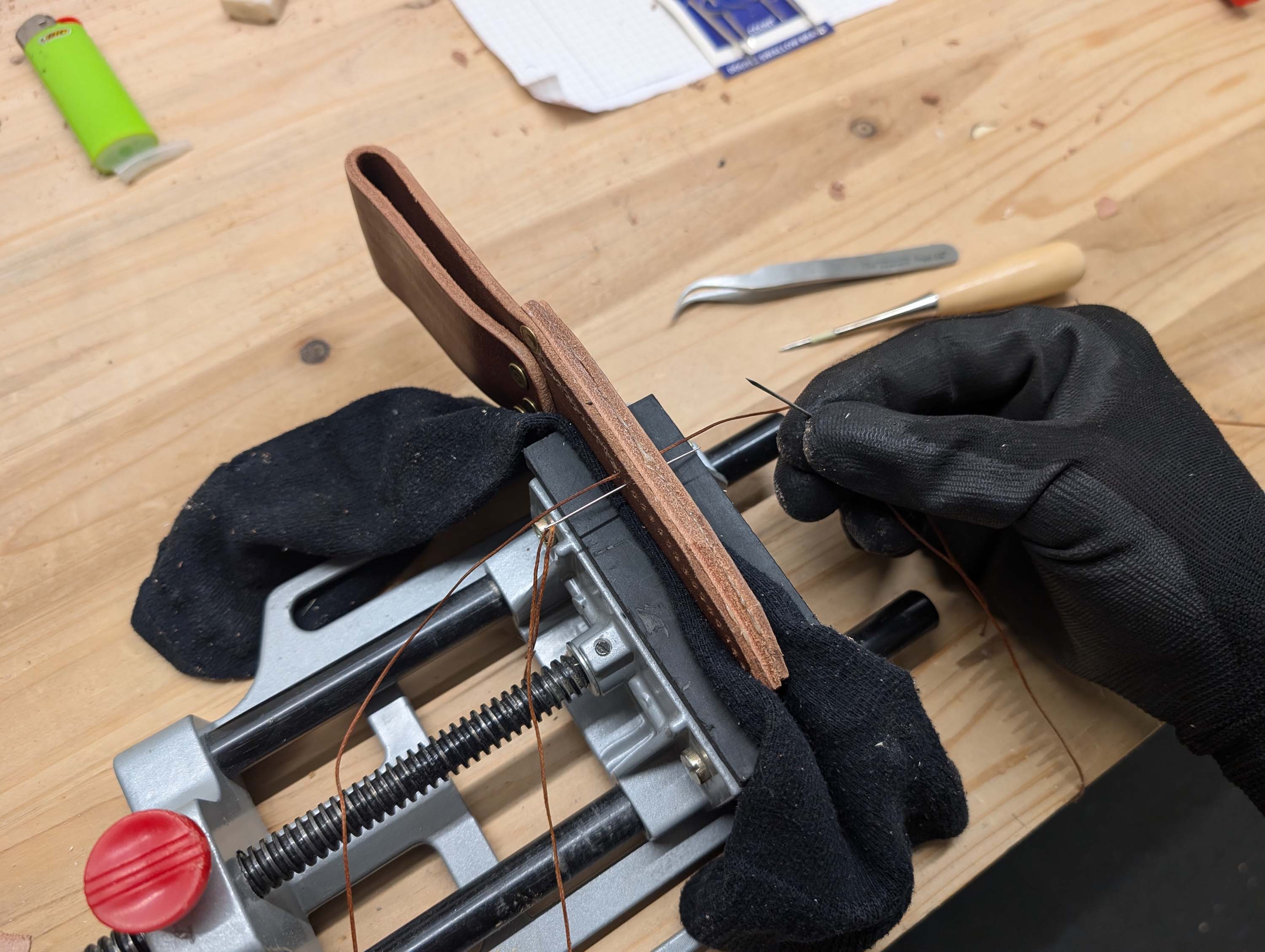 Dieses Jahr habe ich endlich eine passende Lederscheide dafür fertigen können. Auch hier habe ich wieder versucht mit weitgehend simplen Arbeitsmitteln auszukommen. Da ich zum ersten Mal mit Leder gearbeitet habe, war jeder Arbeitsschritt neu für mich - insbesondere die Sattlernaht.