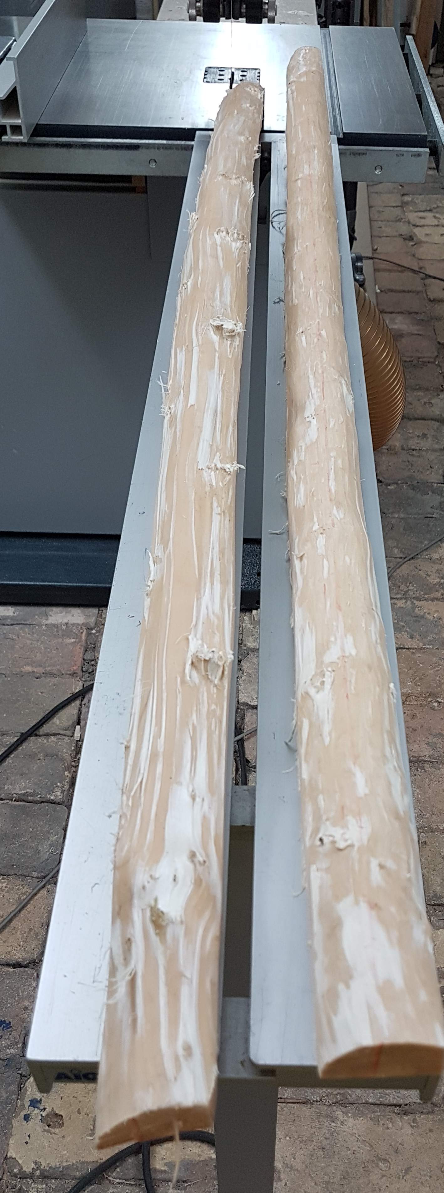 Der stave war ja insgesamt 300 cm und heute habe ich die beiden anderen Stücke geschält und das längere mit ca. 102 cm längs durchgesägt. Daraus könnte ein langer Flachbogen entstehen, ca. 180 cm Länge müsste möglich sein. Mal sehen, beim entrinden habe ich an verschiedenen Stellen den Rücken leicht beschädigt