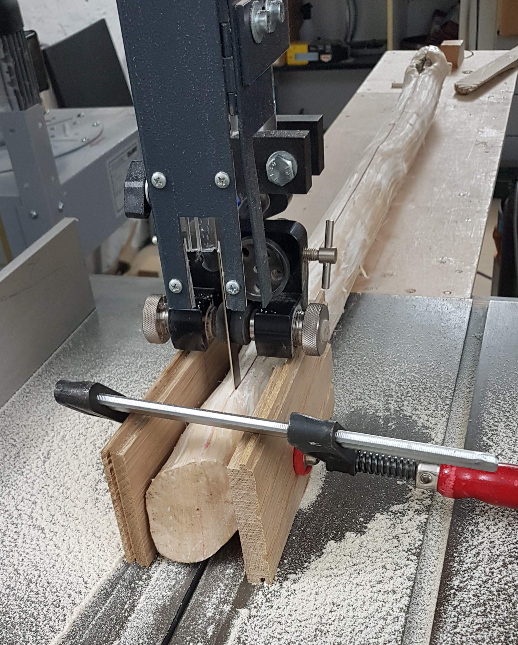 Dann wurde das lange Stück Holz in 3 kurze Stücke verwandelt und das ausgesuchte Mittelteil mit Hilfe der Bandsäge geteilt.