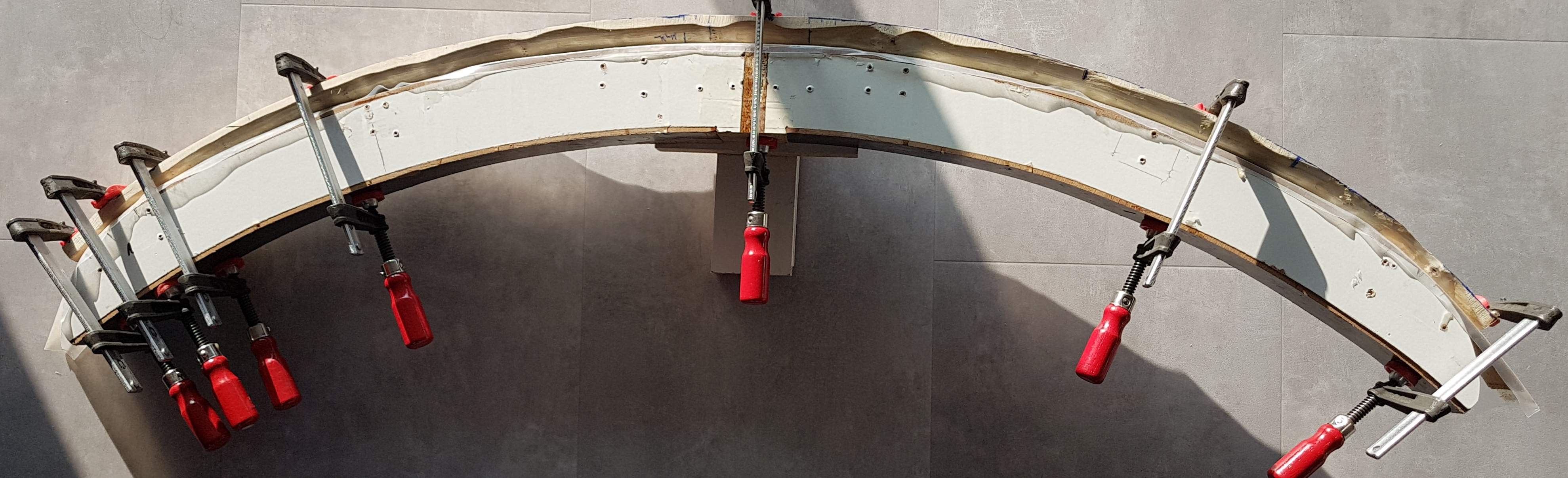 Heute wurde noch etwas Holz mit Hilfe der Bandsäge bauchseitig entfernt. Da mir der Reflex beim oberen und unteren WA zu unterschiedlich war, wurde heute 30 Min. gedämpft und gebogen. Mit dem noch relativ feuchten Holz funktioniert das hervorragend.