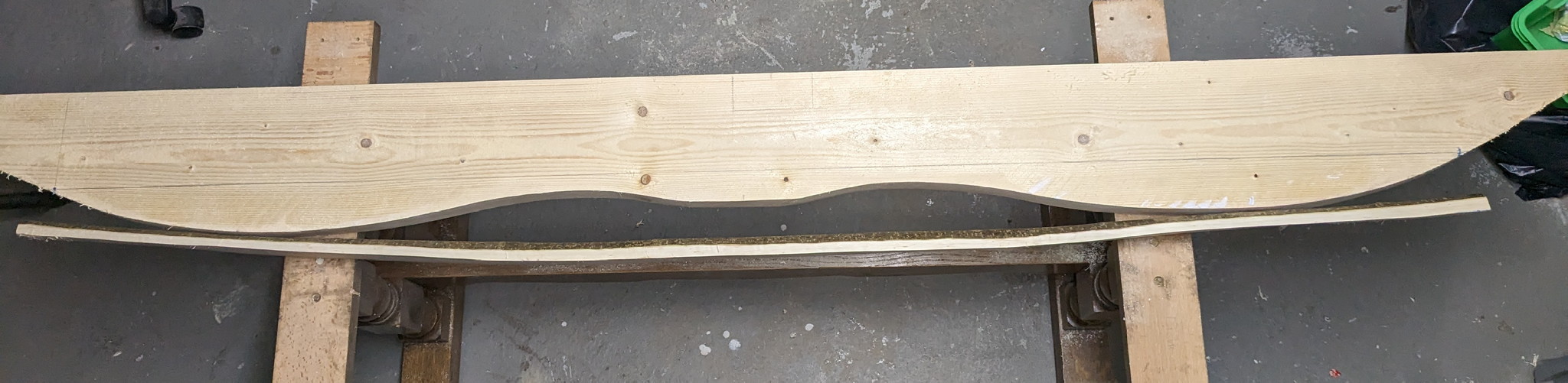 Stave wurde etwas in der Dicke reduziert und die Form vorbereitet (Löcher für die Zwingen fehlen noch). Mal schauen ob ich heute noch biege oder morgen...
