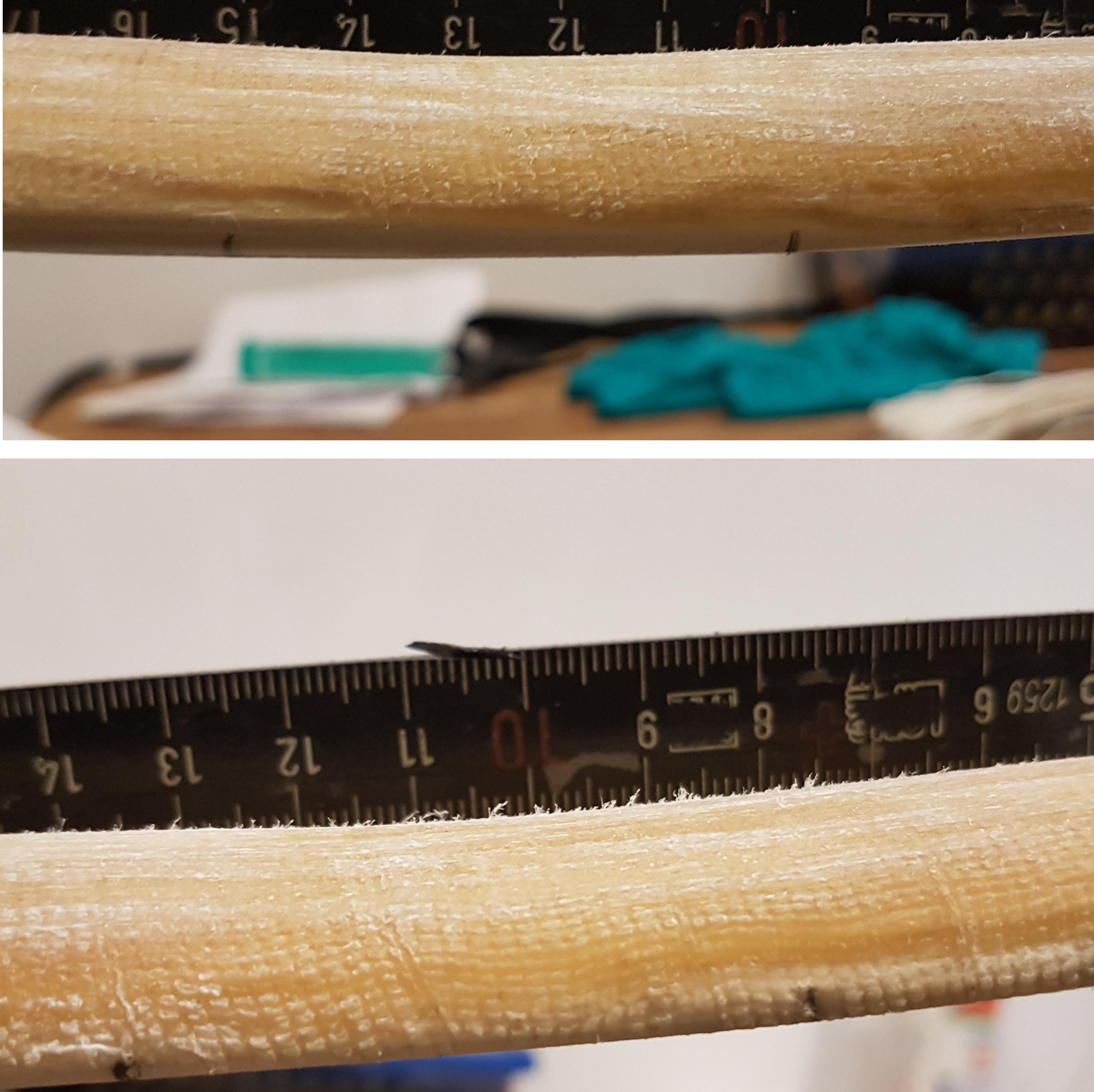 Bogen 01 kurz: Heute wurden die mittleren 42 cm nachgearbeitet. Die Sehnenlage hate für meinen Geschmack zuviele Beule auf dem Rücken, deswegen wurden diese weggeschnitten und -geschliffen. Außerdem gab es an jedem WA in etwa an der gleichen Position eine 45 mm lange, deutlich dünnere Stelle als am Rest der Wurfarme. Für diese Stellen habe ich eine Rückensehne nur gehämmert und nicht zerfleddert und als Füllmasse aufgeklebt. Darüber kam dann eine finale Sehnenlage. Mehr Sehnen gibt es jetzt nicht mehr, die Zeit wird sonst zu knapp. Ich will dieses Jahr unbedingt schießbare Bogen in der vorgegebenen Zeit fertig bekommen.