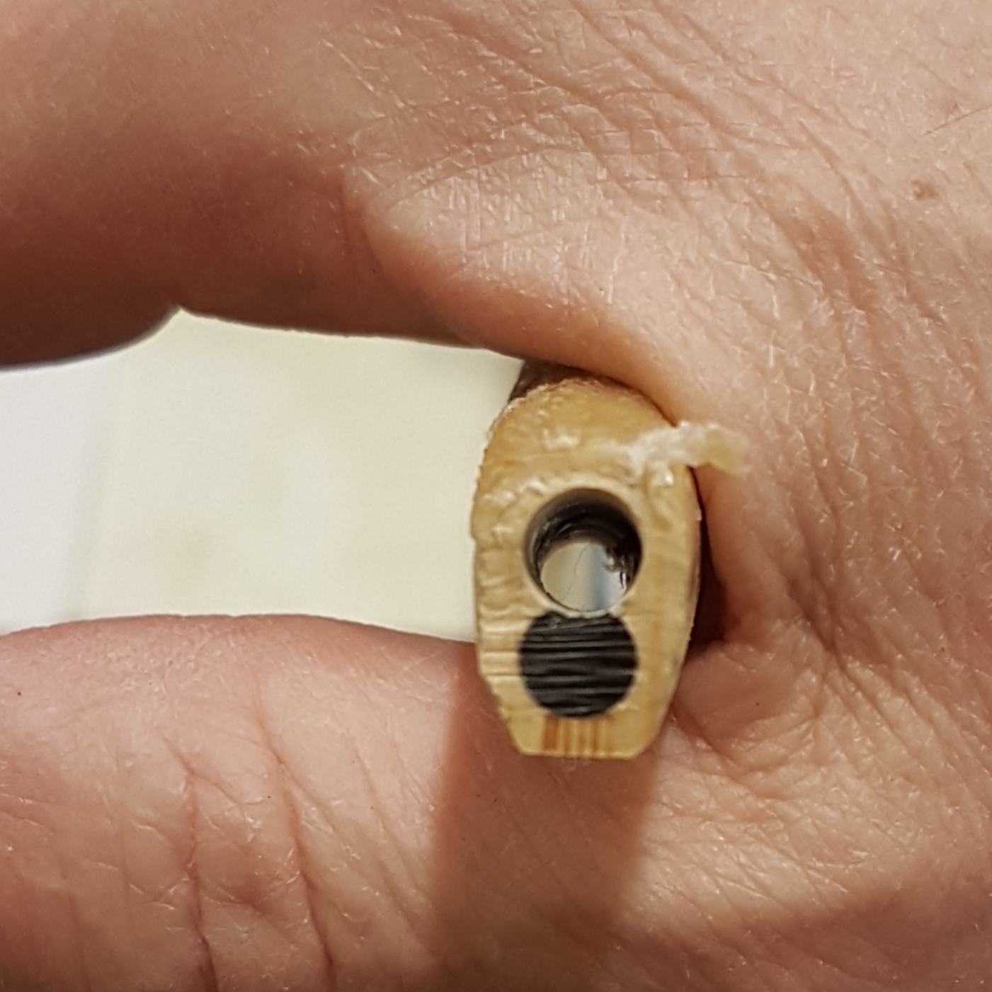 Der Dübel sitzt auch etwas dezentral, eher bauchseitig (wenn die Optik nicht täuscht). Ja, das stimmt und genau genommen bin ich damit nicht zufrieden.