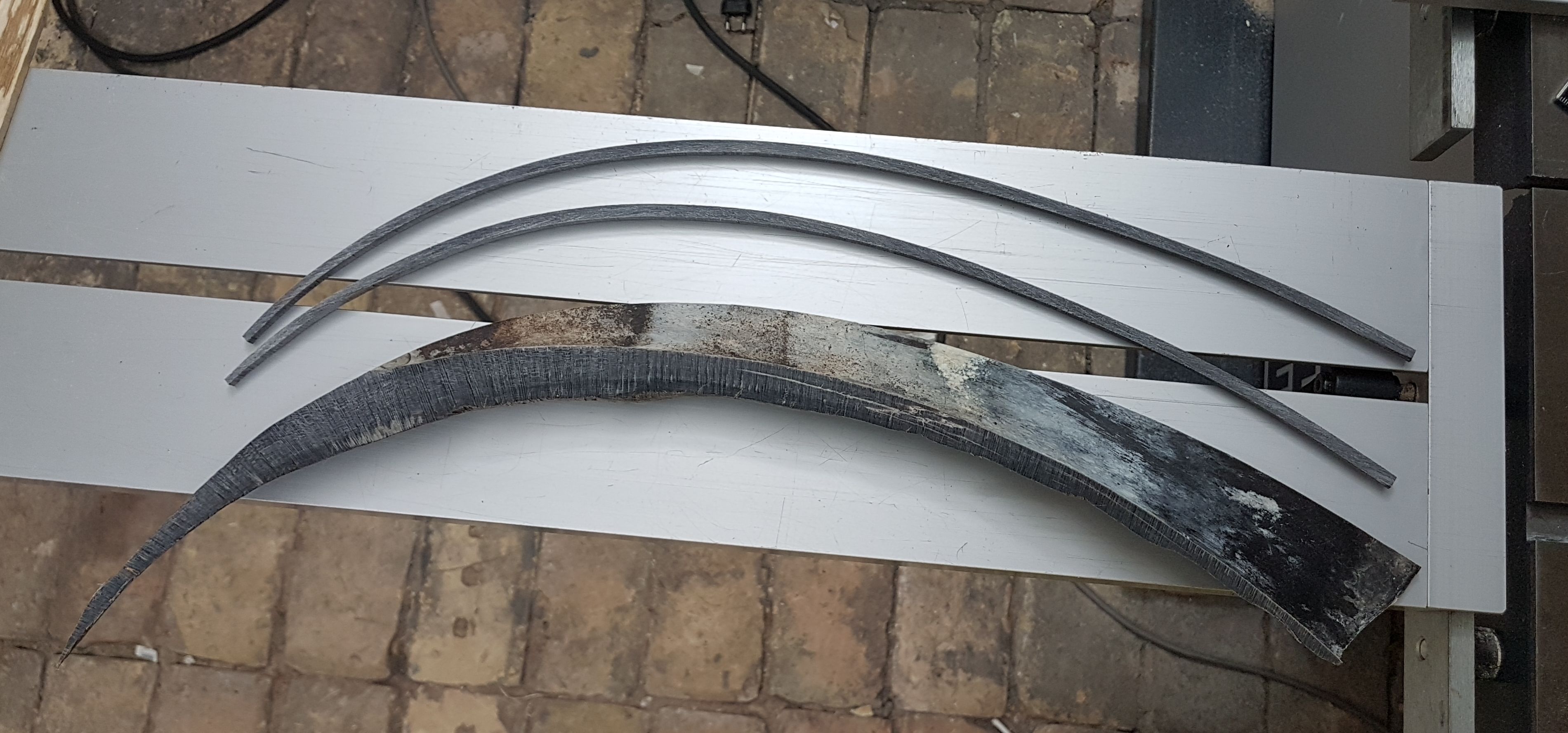 Wie dem auch sei - ich habe die Mitte zurecht gebogen und wieder einmal ein Experiment gestartet. Ich habe einige Horn-Seitenteile rumliegen und einige Streifen geschnitten, getestet ob die Dinger die erforderliche Biegung mitmachen und etliche in die Tonne geschickt. Aber zwei Teile finde ich OK, also habe ich die Dinger etwas begradigt, zueinander passend geschliffen und gegenläufig auf den Bauch geklebt. Die Streifen sind zusammen max. 12 mm breit und max 5 mm dick. Die Länge ist 50 cm. Mal sehn ob der Kleber das mitmacht. Eigentlich wollte ich bei diesem Bogen kein Epoxid einsetzen, Glutinleim war mit aber zu aufwendig.