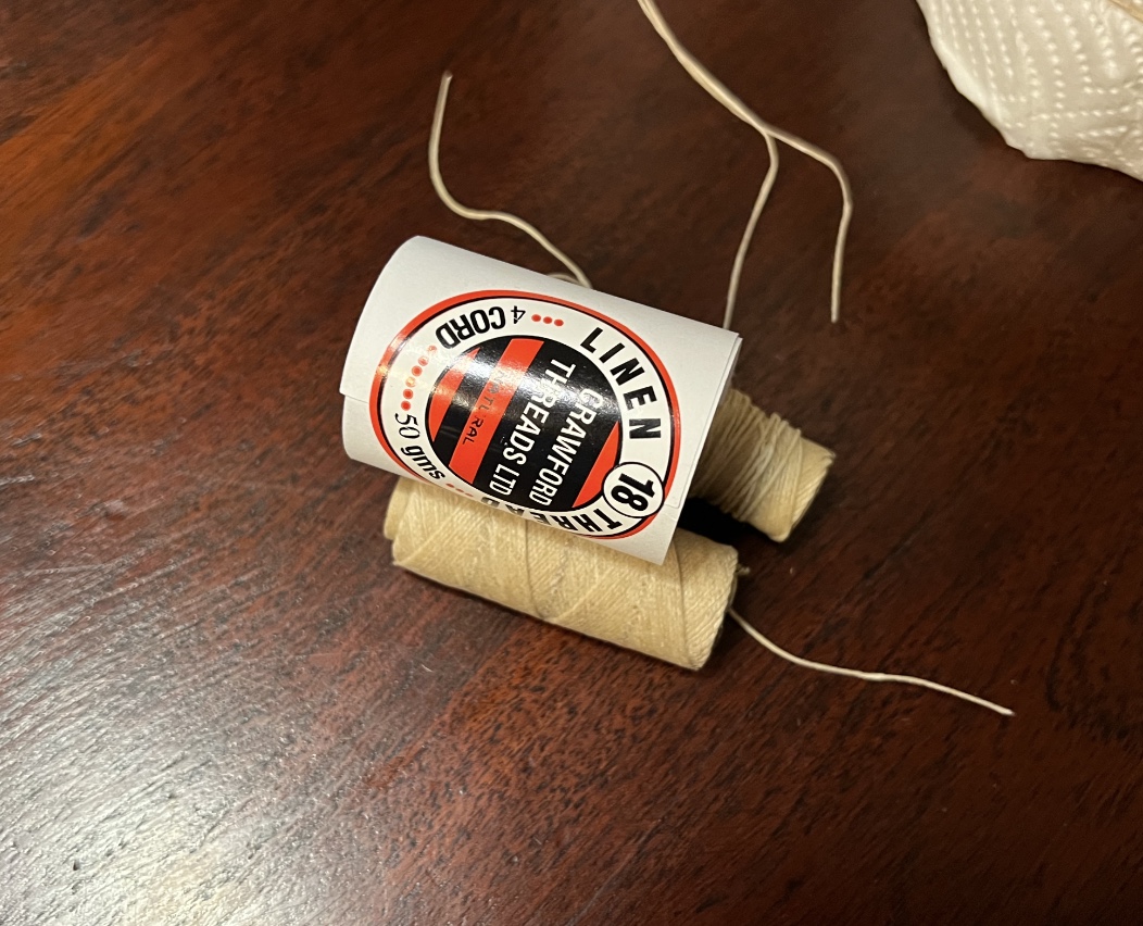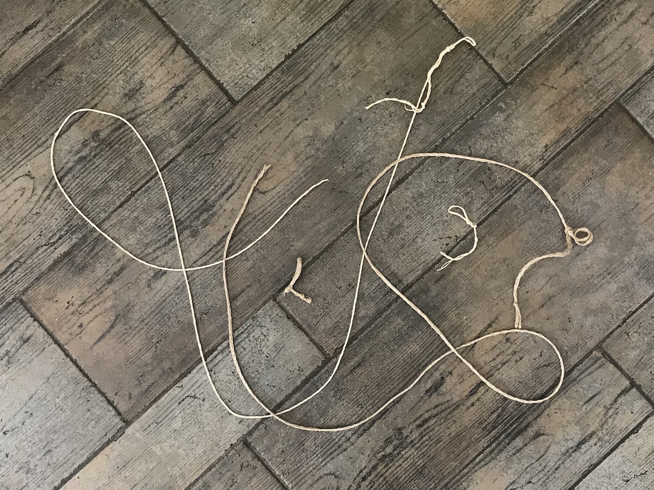 Hier habe ich keine Juteschnur verwendet, sondern zwei 40m lange gewachste Leinenfäden mit der Bohrmaschine verdrillt. Geteiltes Kabel, 10 Stränge über die gesamte Länge, 16 von Knie zu Knie, (insgesamt somit 26x2 Fäden, weil ein Strang besteht ja aus 2 Fäden), der Kabelteiler ist aus dem ausgeschiedenen verzogenen Holunder gesägt. Damit hat sich der Holler auch verewigt, wenn er schon kein Bogen werden wollte. Jetzt kommt noch ein Griff aus einem Lederstreifen und eine gedrehte Leinensehne.