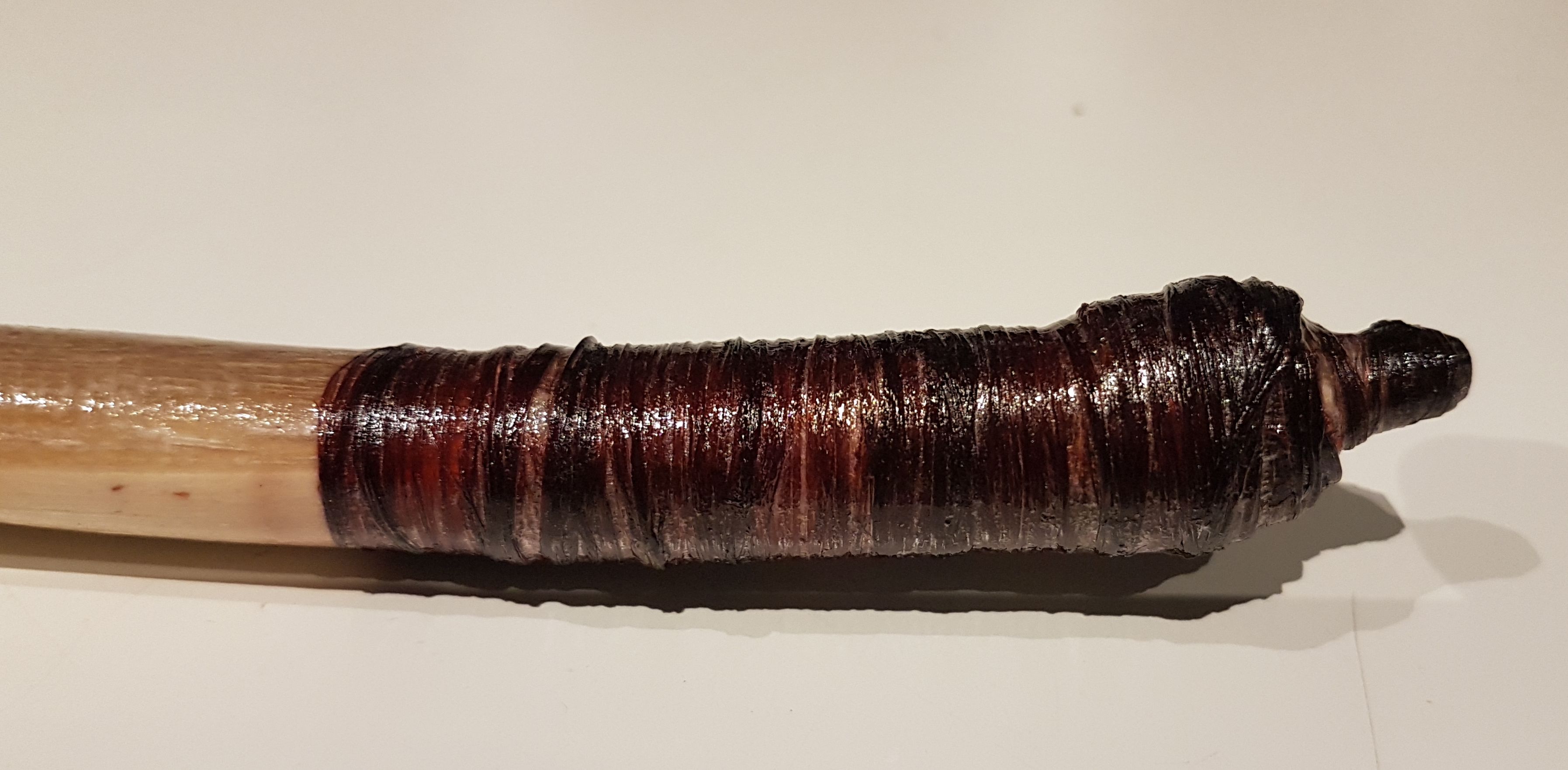 Bogen 01 kurz: die Wickelnocken habe ich geschliffen und frische Sehnen aufgeklebt. Und da es wohl im Saplingbow immer Probleme gibt wenn ich was zu bauen versuche, gibt es natürlich ein Problem, eigentlich zwei
