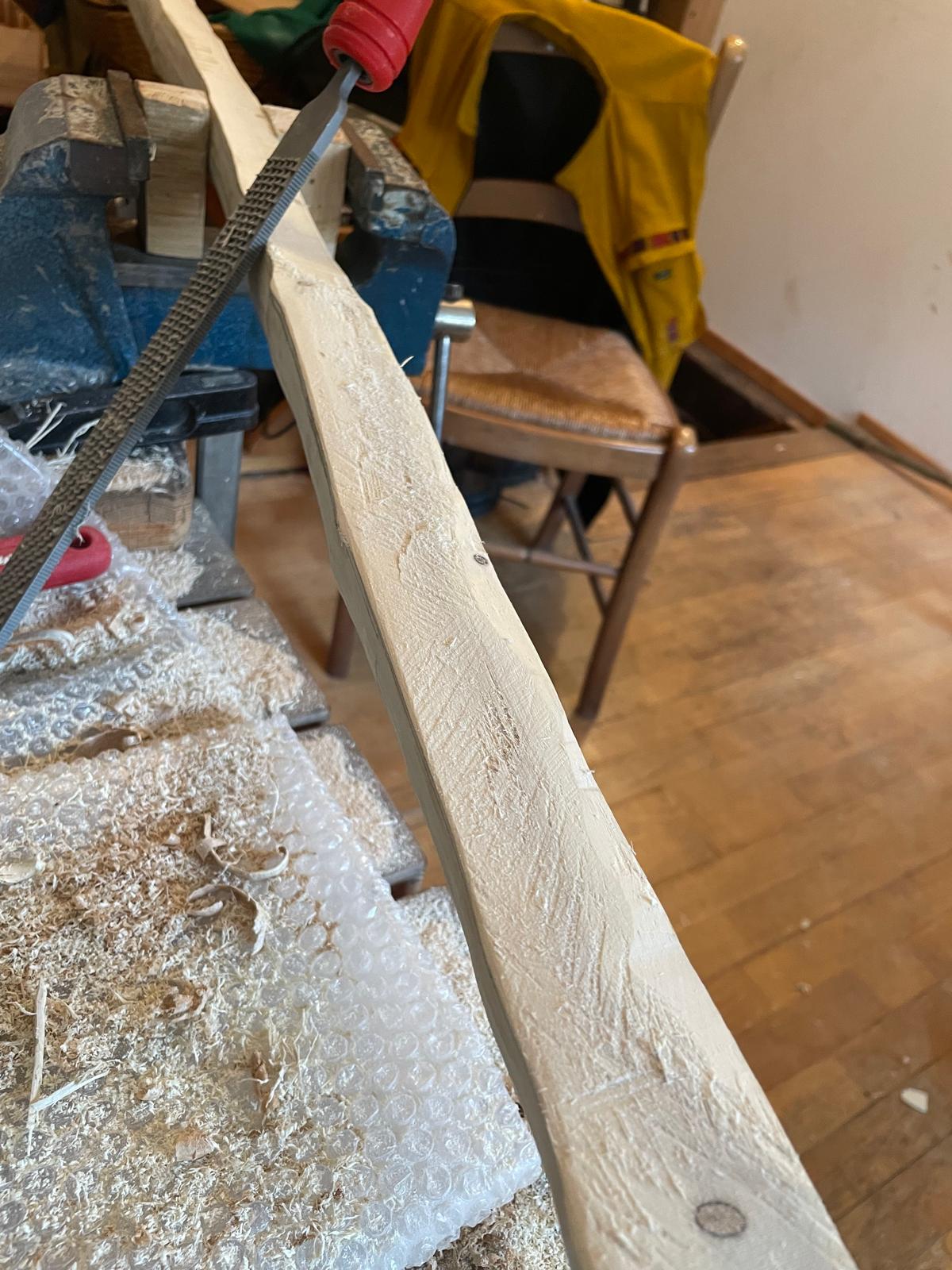 was ich auch krass fand: nachdem ich mit der Bandsäge die Form ausgesägt habe, bin ich wieder mit dem Ziehmesser ran, und das Holz war erst mal mega hart. hier auf dem Foto sieht man auch den Unterschied an der Oberfläche zum Teil sägerauh, zum Teil mit dem Ziehmesser bearbeitet