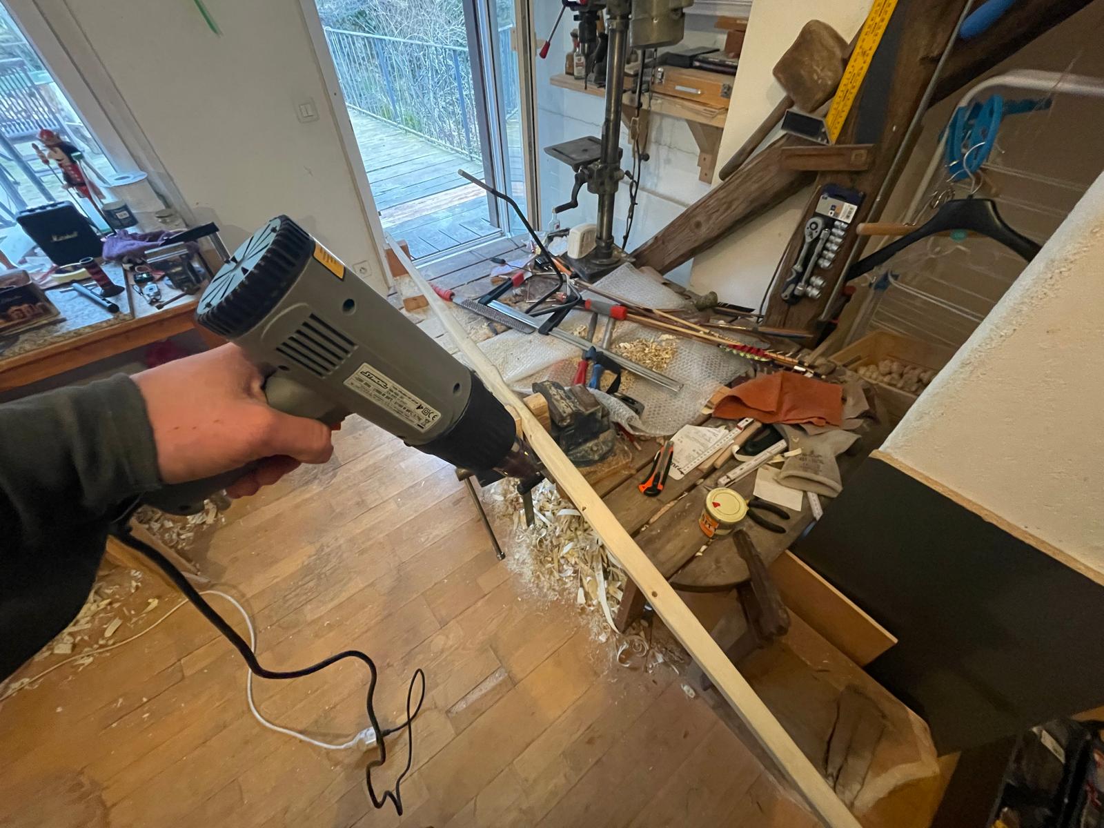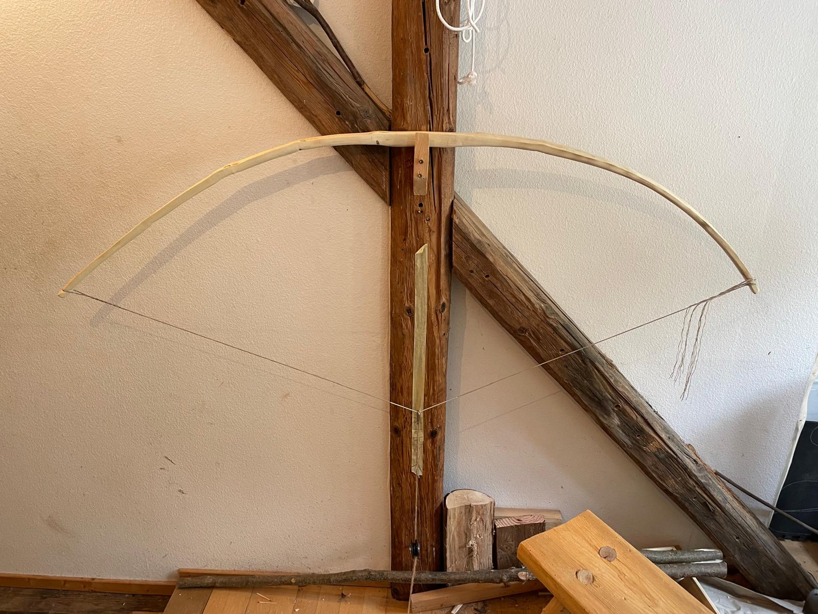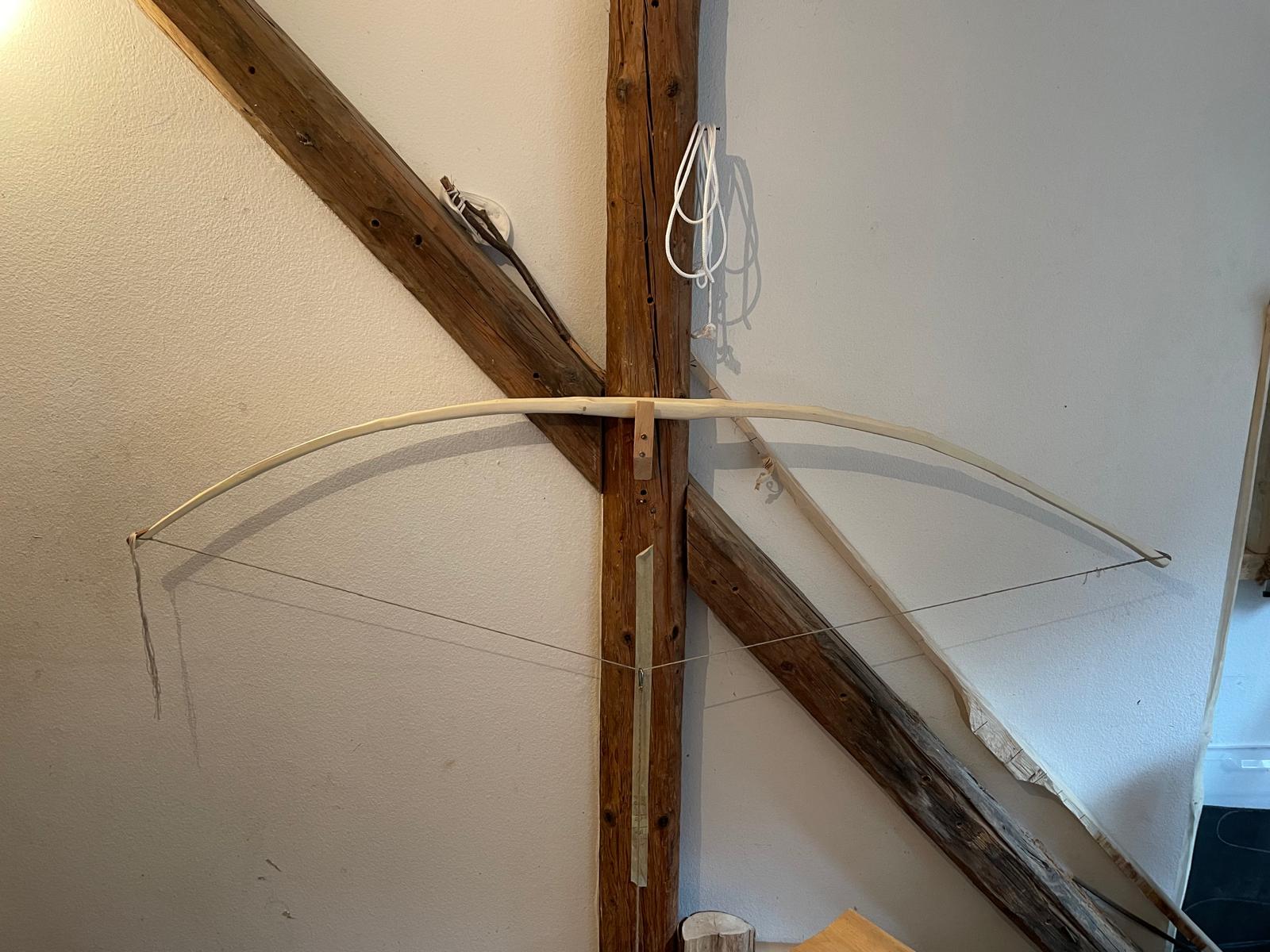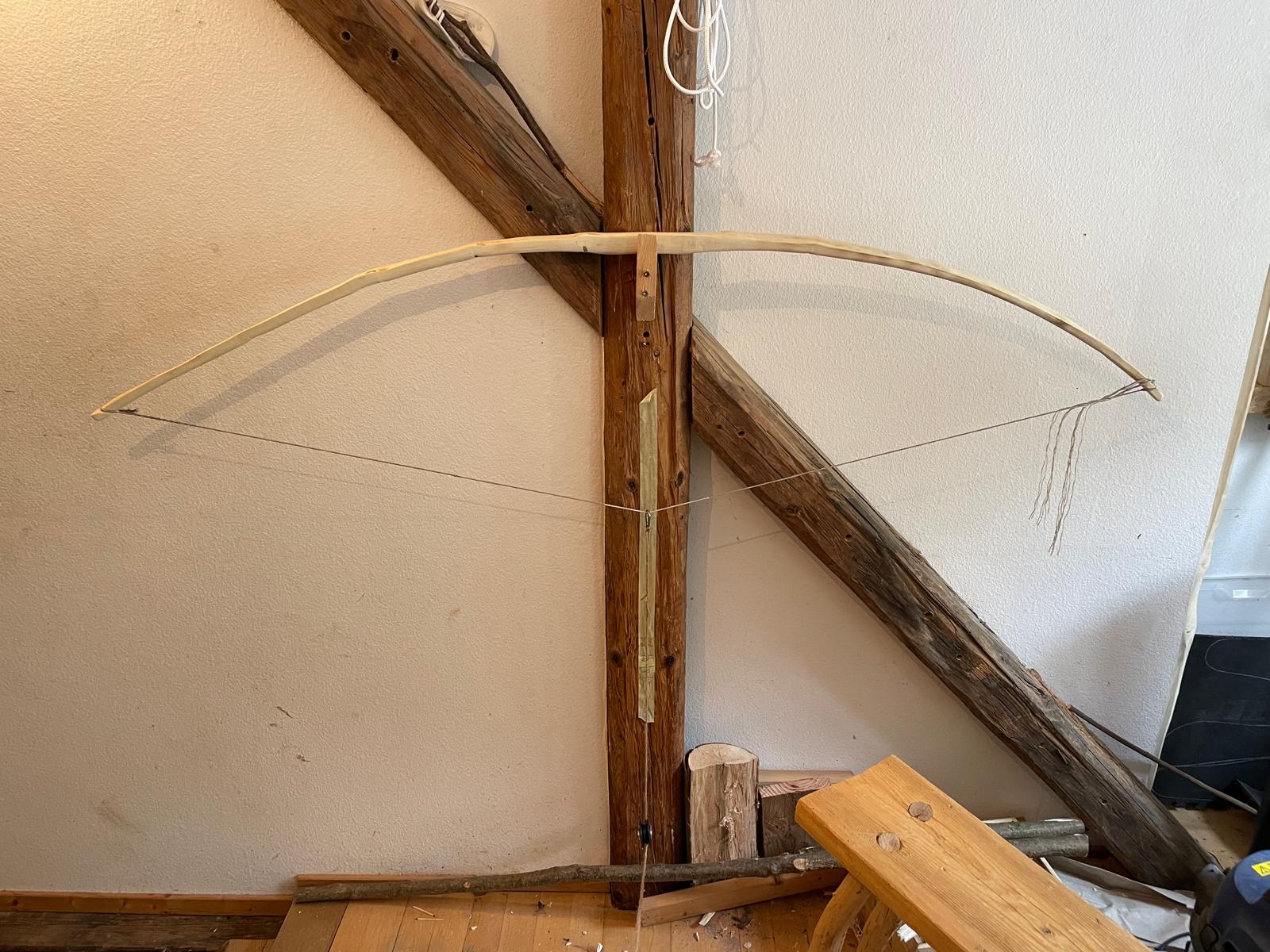 Der Ilex ist jetzt auf Standhöhe aufgespannt. 48# bei 30" Auszug. Is natürlich noch sehr nass, deshalb versuch ichs mal mit Föhnen nach dem Abspannen und hoffe, dass es mir reicht bis zur deadline. Schießen werd ich ihn dann mal am Freitag.