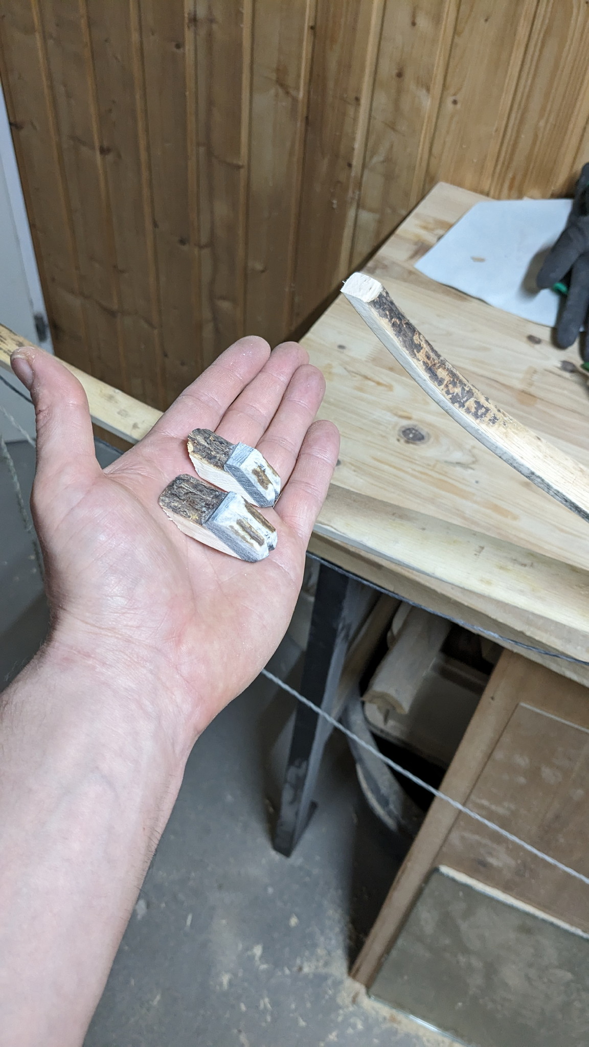 Nockoverlays aus Horn und Geweih. Die Rinde habe ich auch runter gekratzt und geschliffen. Bast sieht ziemlich unterschiedlich und wild aus. Entweder sieht das nach den Finish super oder richtig mies aus