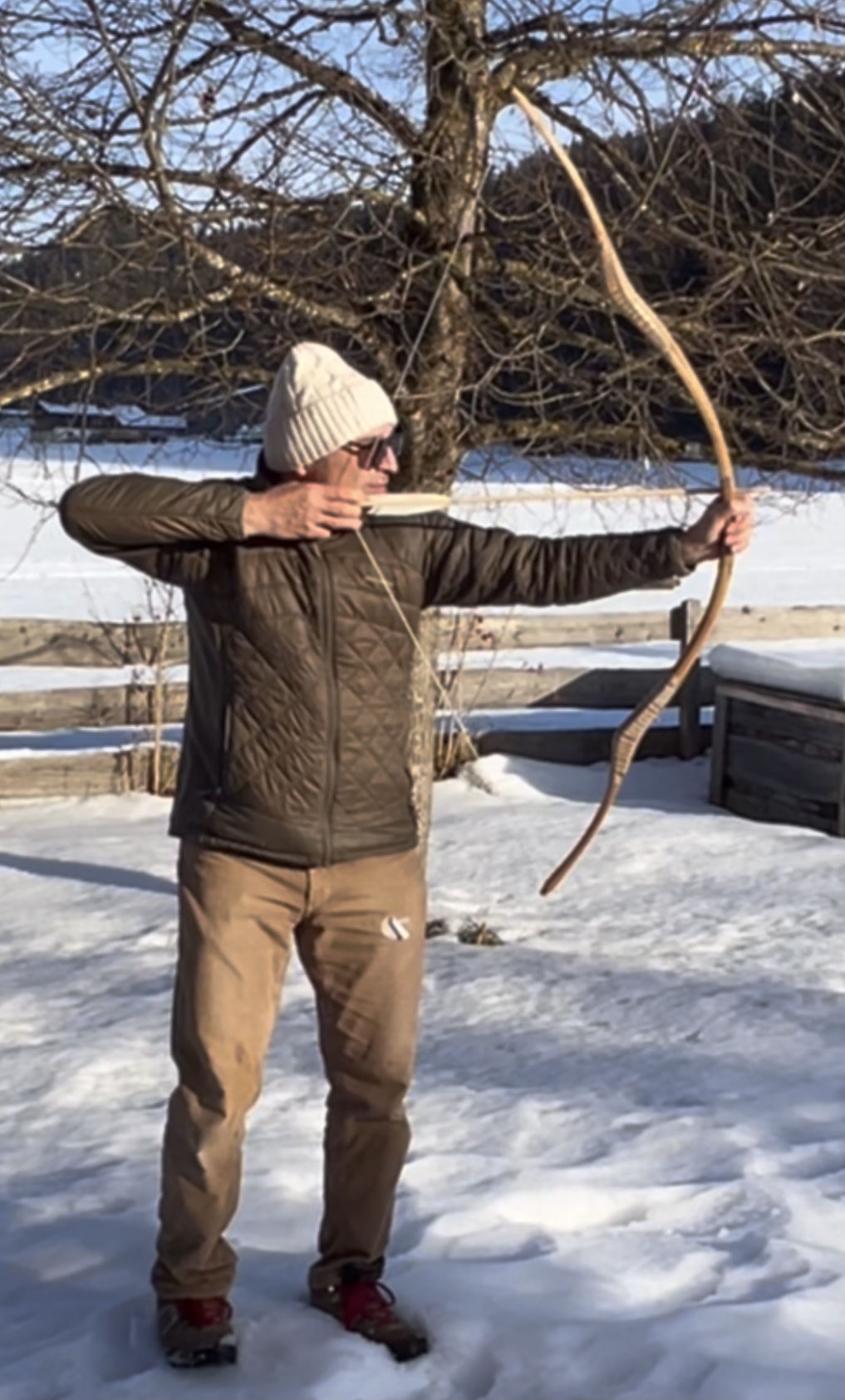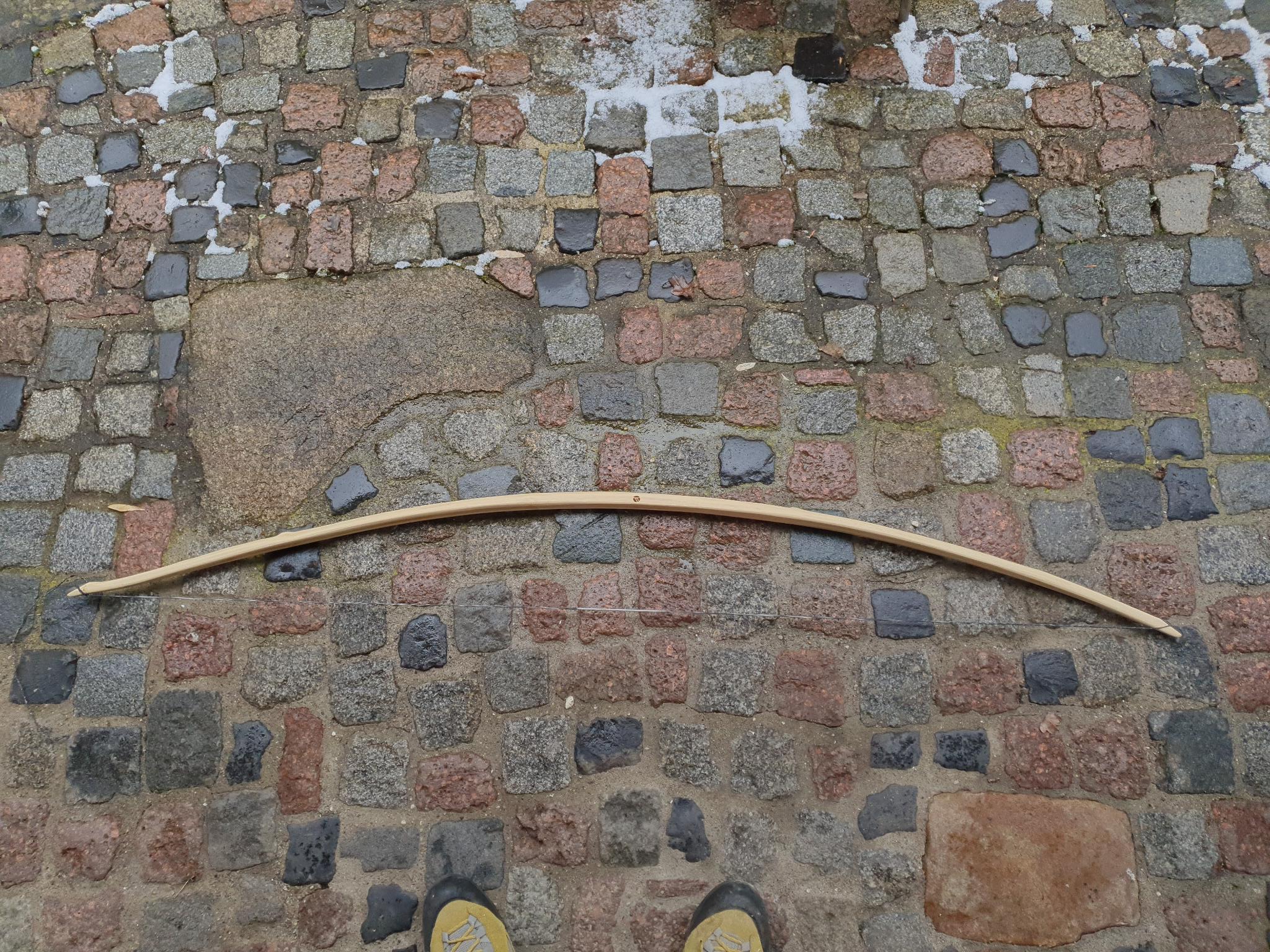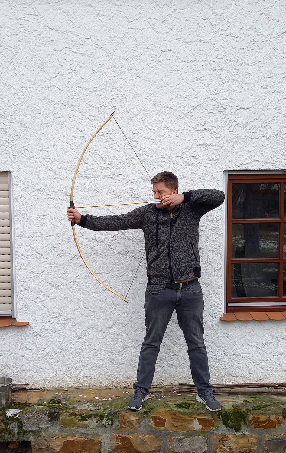 Der Bogen schießt sich überraschend gut, wenig Handschock, trotz der Griffbreite bei 26 Zoll Auszug und Haselschößlingspfeil mit 45 Pfund Spine akkurat. Bei kurzem Auszug Abweichung nach links. Pfeil hebt gut ab, kein Hautkontakt. Gutmūtig und keine Kanone