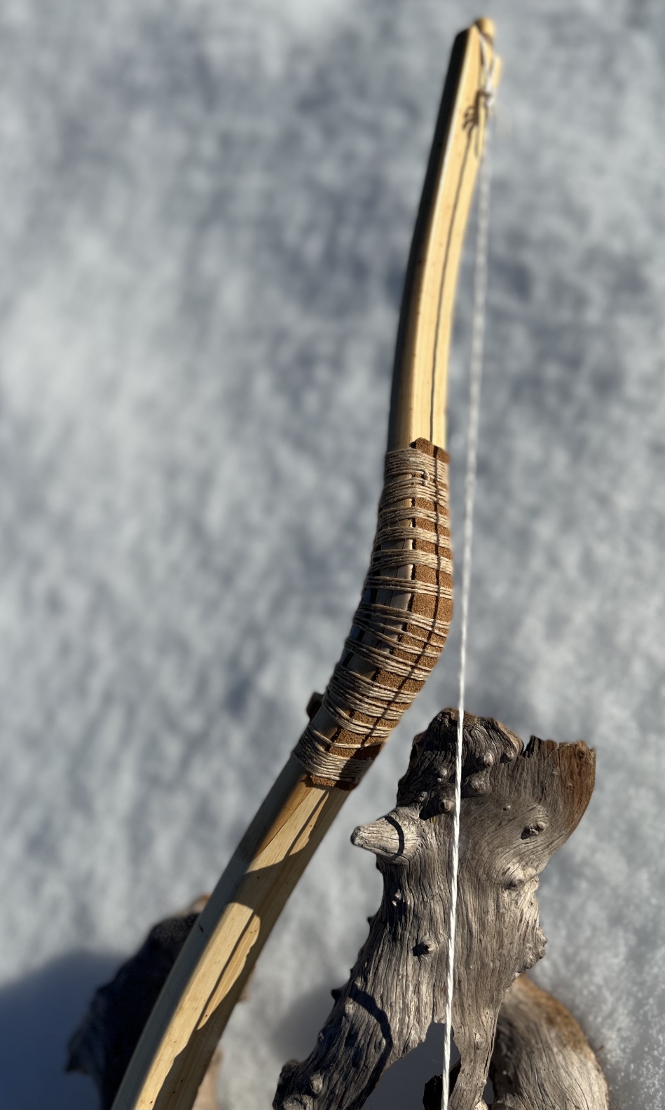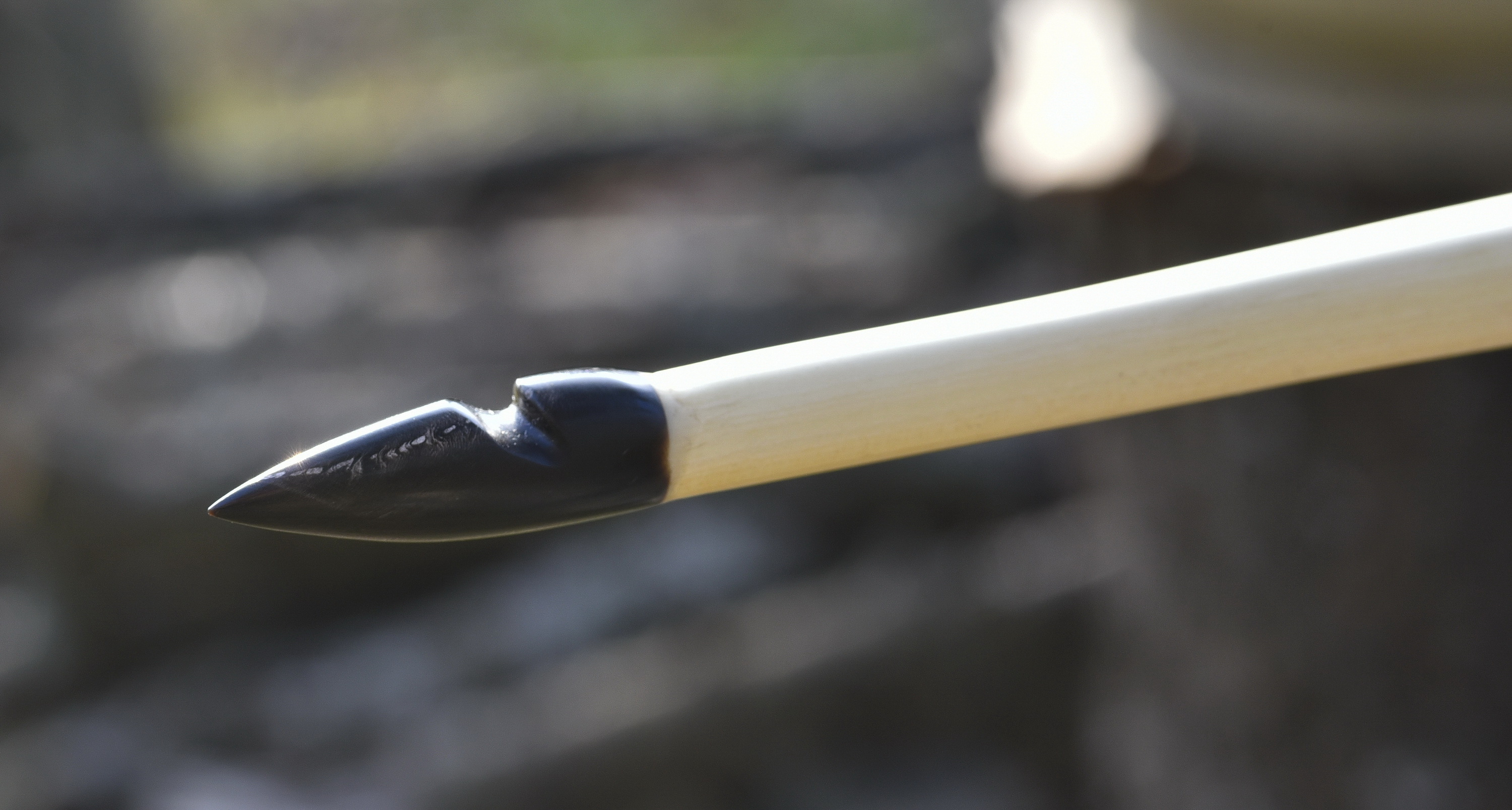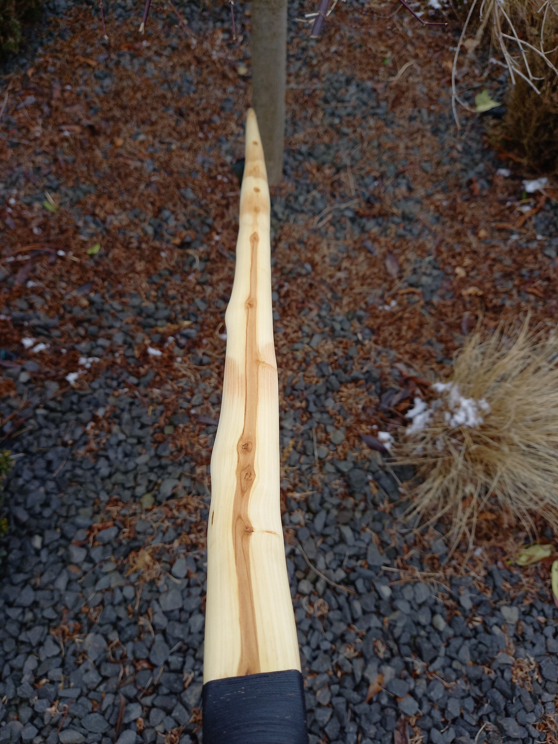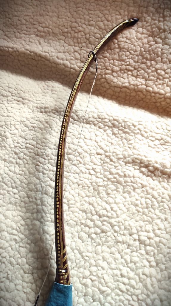 Der Bogen schießt sich überraschend gut, wenig Handschock, trotz der Griffbreite bei 26 Zoll Auszug und Haselschößlingspfeil mit 45 Pfund Spine akkurat. Bei kurzem Auszug Abweichung nach links. Pfeil hebt gut ab, kein Hautkontakt. Gutmūtig und keine Kanone