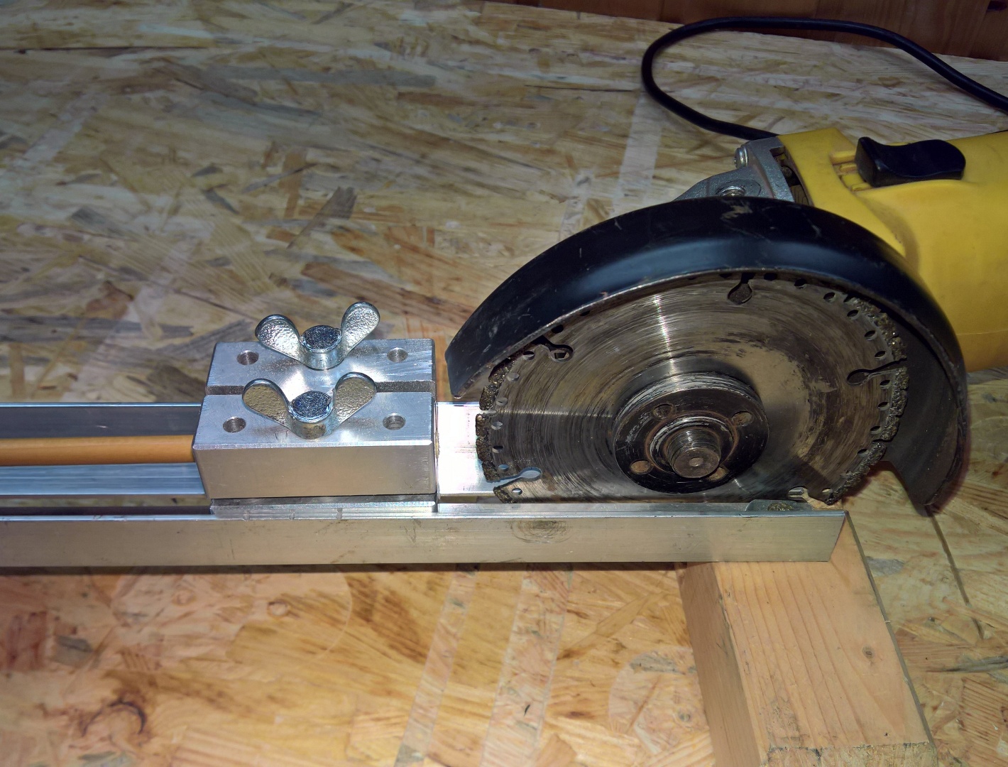 Ich habe mir dann so einen kommerziell erhältlichen Aluminiumblock mit Führungsnuten, Schlitzen und Flügelmuttern und ein Fliesensägeblatt für die Bügelsäge gekauft und hatte gehofft, das steigere meine Präzision, war dann aber immer noch unzufrieden, weil ich dann anfing, den Alublock neu zuzusägen (ist halt etwas weicher als die Diamanten auf dem Sägeblatt...).