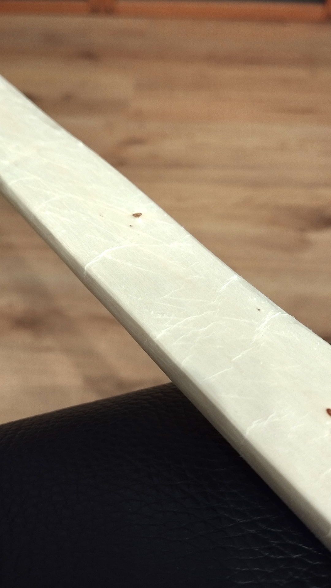 Ohne Vorkenntnisse und einen klaren Plan habe ich nur mit dem Messer die Form 64“ Nock to Nock ausgearbeitet und nach dem Tocknen mit dem Bodentillern begonnen. Nachdem es für mich akzeptabel ausgesehen hat, habe ich eine Paracordschnur 62“ aufgezogen und den Bogen vorsichtig ein paar mal auf ca. 20“ gespannt. Dabei sind mir dann schon erste Kompressionsschäden aufgefallen. Habe noch etwas nachgearbeitet und beim weiteren Spannen ist der Bogen dann gebrochen.