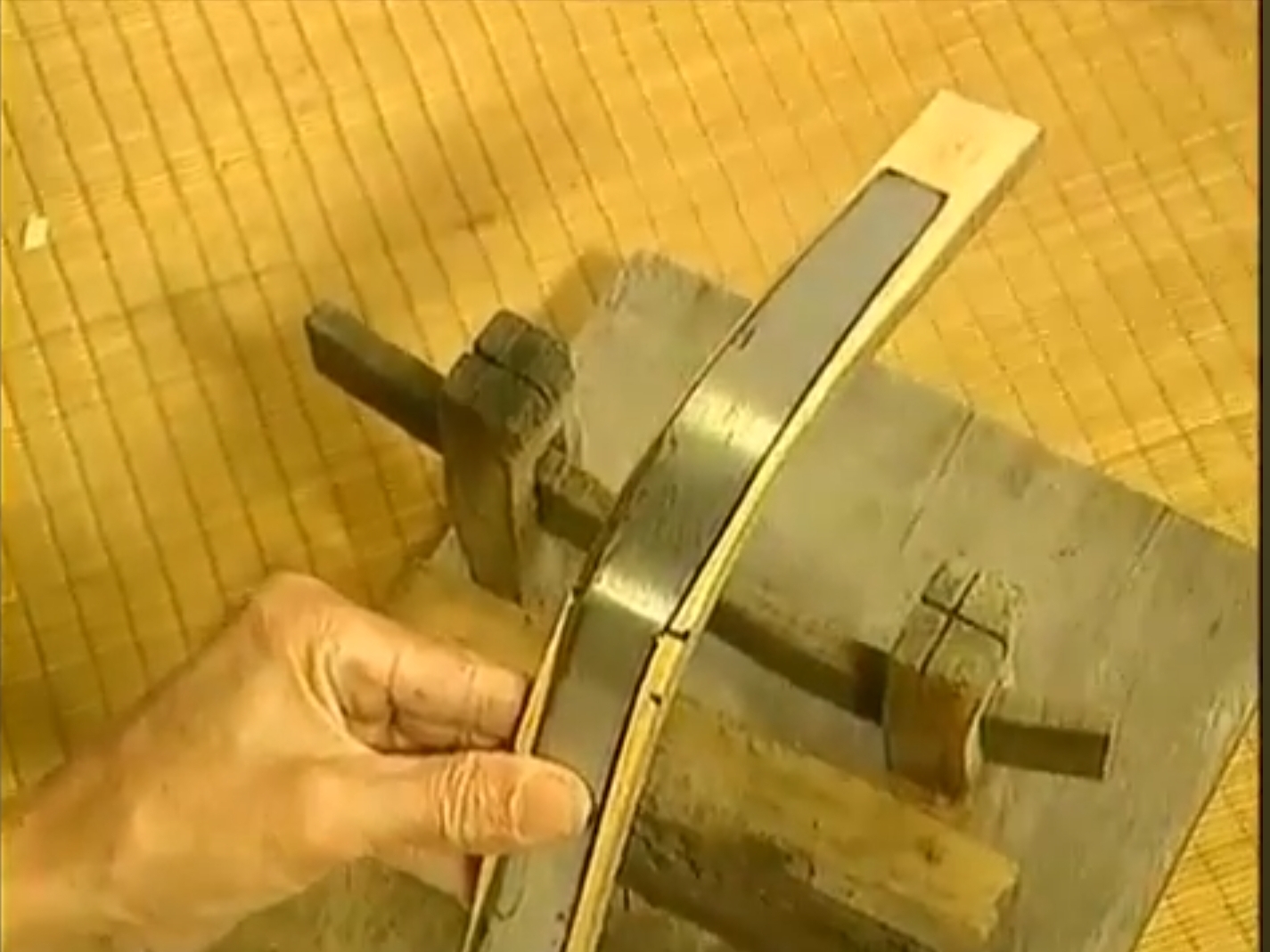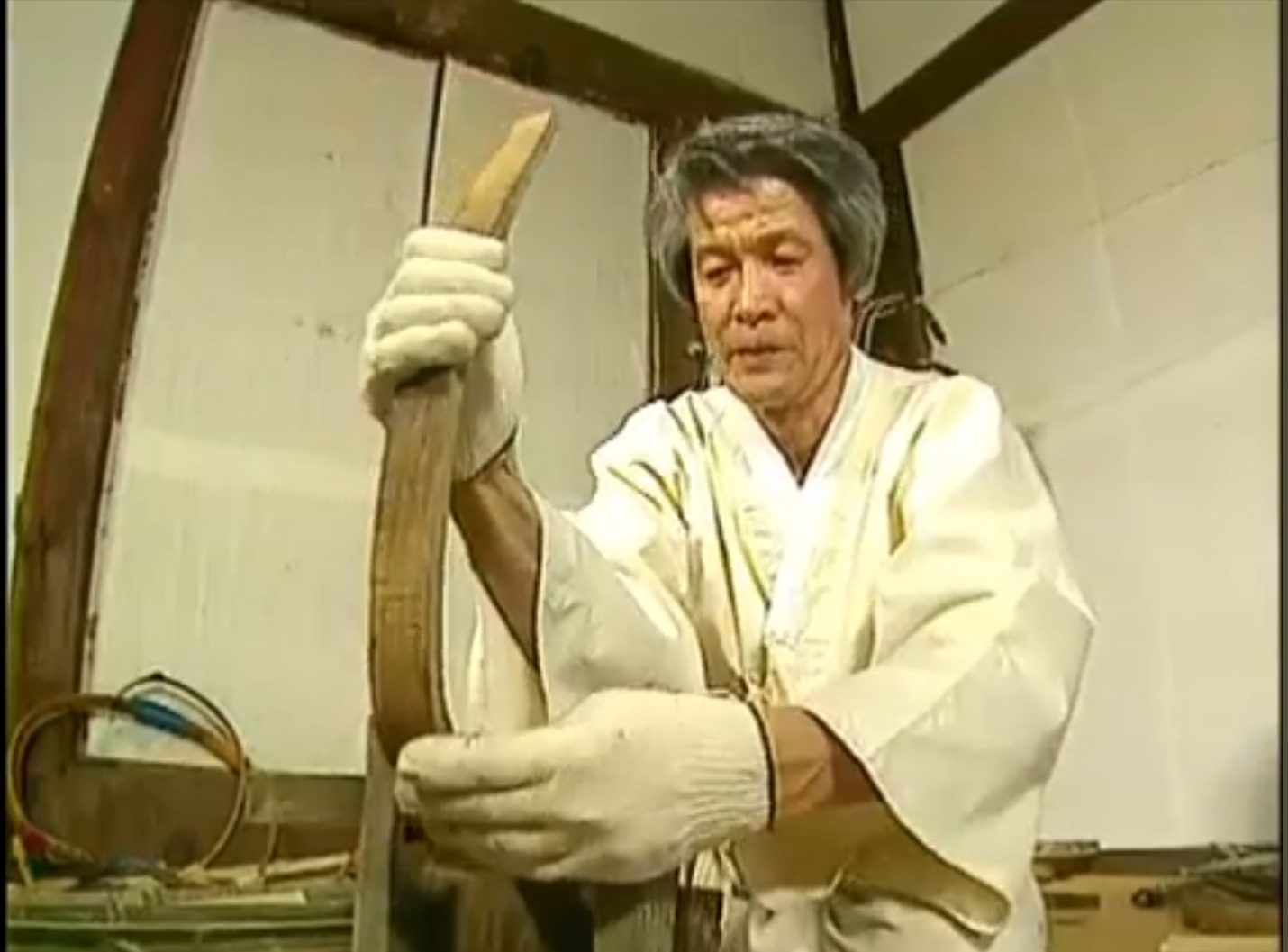 Hier ist zu erkennen dass der Spleiß keine geraden Linien hat, sondern leicht gebogene. Die Form des Spleißes wird dann vom Siyah direkt auf den Bambus übertragen und ausgesägt. Hier fällt auf dass der Schnitt mit der Säge ein ganzes Stück weiter in den Wurfarm fortgesetzt wird. Dies bewirkt dass sich der Spleiß vom Bambus beim zusammenfügen mit dem Siyah etwas auseinander drücken lässt. Dadurch halten die Teile beim verkleben besser zusammen. Der Spleiß wird dann mit Schwimmblasenleim geklebt (sowie alle weiteren Klebungen auch) und mit Schnur umwickelt. Nun wird der Bambus im bereich des Griffs Rückenseitig ausgedünnt. Die Bauchseite des Rahmens wird nun Verzahnt , sowie die ausgedünnte Stelle für die Griffschale Rückenseitig und die Griffschale selbst. Hier fällt nur indirekt auf, dass der runde Bogenbauch vom Bambus flachgefeilt wurde. Nun werden 2 Hornstreifen (einer je Wurfarm) ebenfalls mit Schwimmblasenleim mit dem Rahmen verklebt. Dafür wird innenliegend eine Holzform für die Formgebung und zum verhindern von Verdrehungen beigelegt. Im Video ist zu sehen dass auch über das Horn etwas beigelegt wird. Dann wird alles Stramm mit einem Seil umwickelt. Im Video wird das Werkzeug dafür als "Lever" also Hebel übersetzt. Wenn jemand den Fachbegriff dafür weis, immer her damit