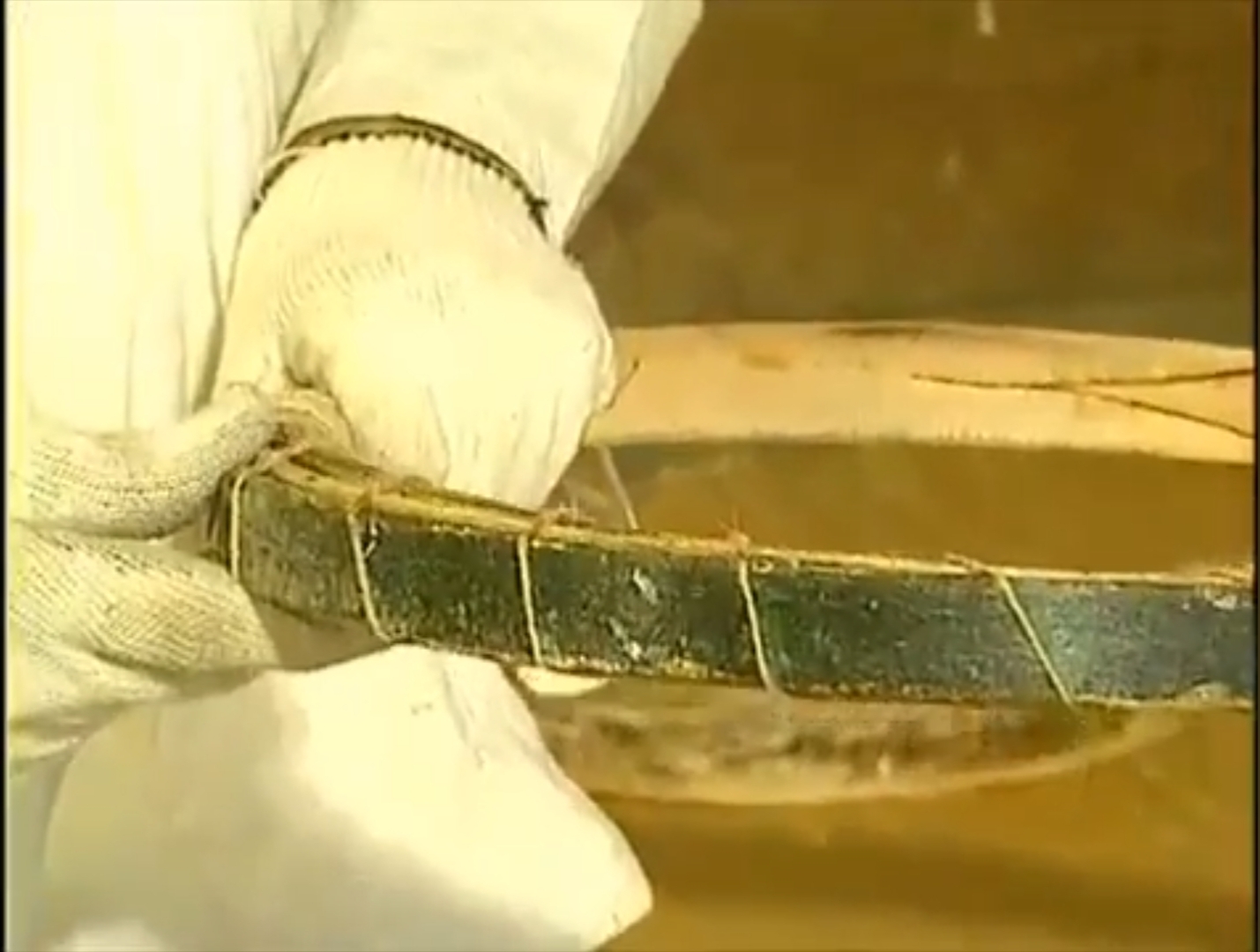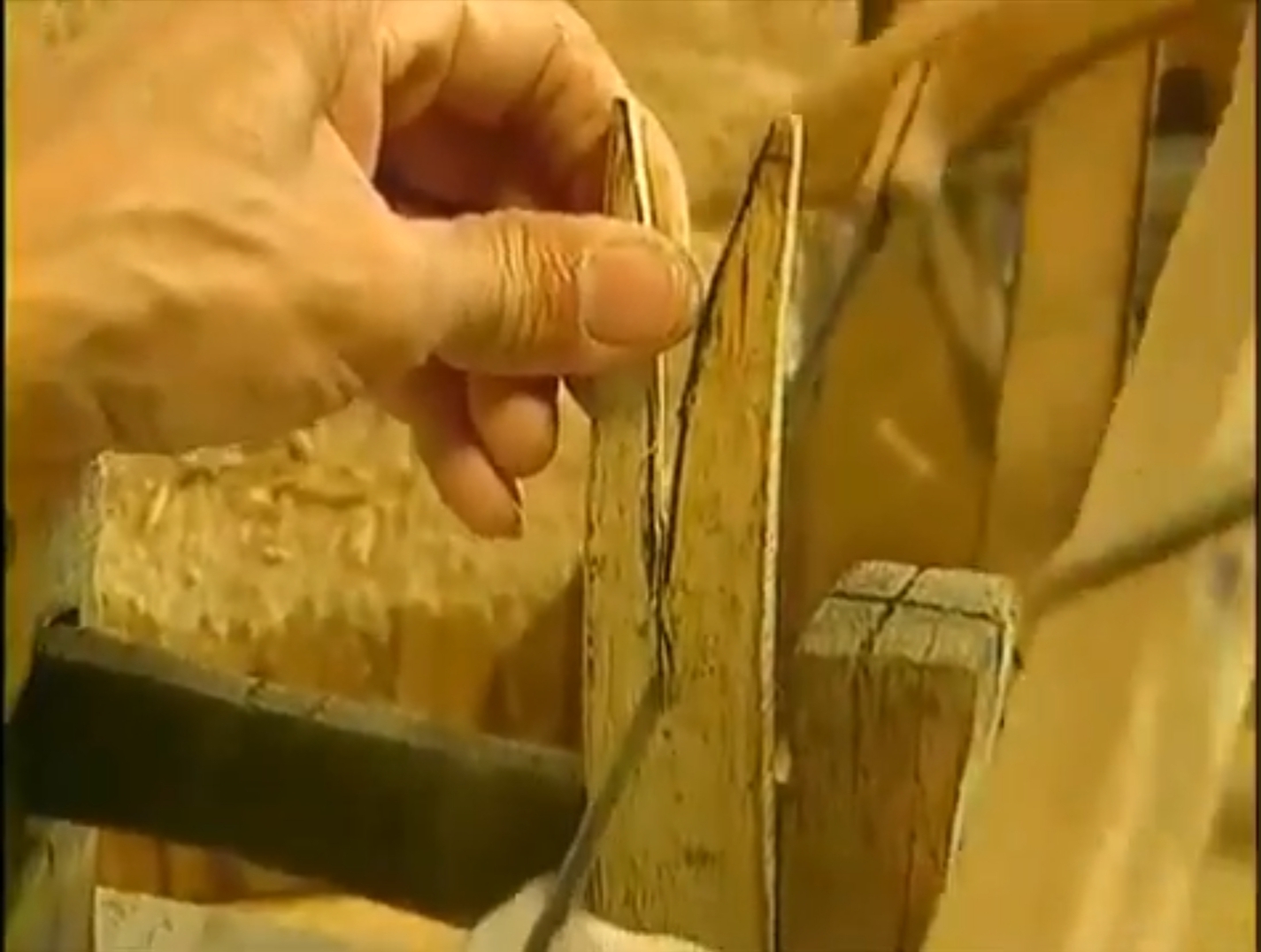 Der Rücken wird nun fertig ausgeformt. Im Video schlecht zu erkennen ist der genaue dickenverlauf und die Formgebung im Bereich des Siyahs. Hier wurde eigentlich der ganze Rücken Ellipsenförmig ausgearbeitet. Nur der Bereich des Siyahs nach dem stark reflexen Knick ist noch in Rohzustand. Danach werden die Enden mit Hilfe eines Holzplättchens zusammengebunden. Anschließend wird der Rücken mit Schwimmblasenleim grundiert. Besonders interessant finde ich es, wie die Sehnen für den Belag vorbereitet werden.