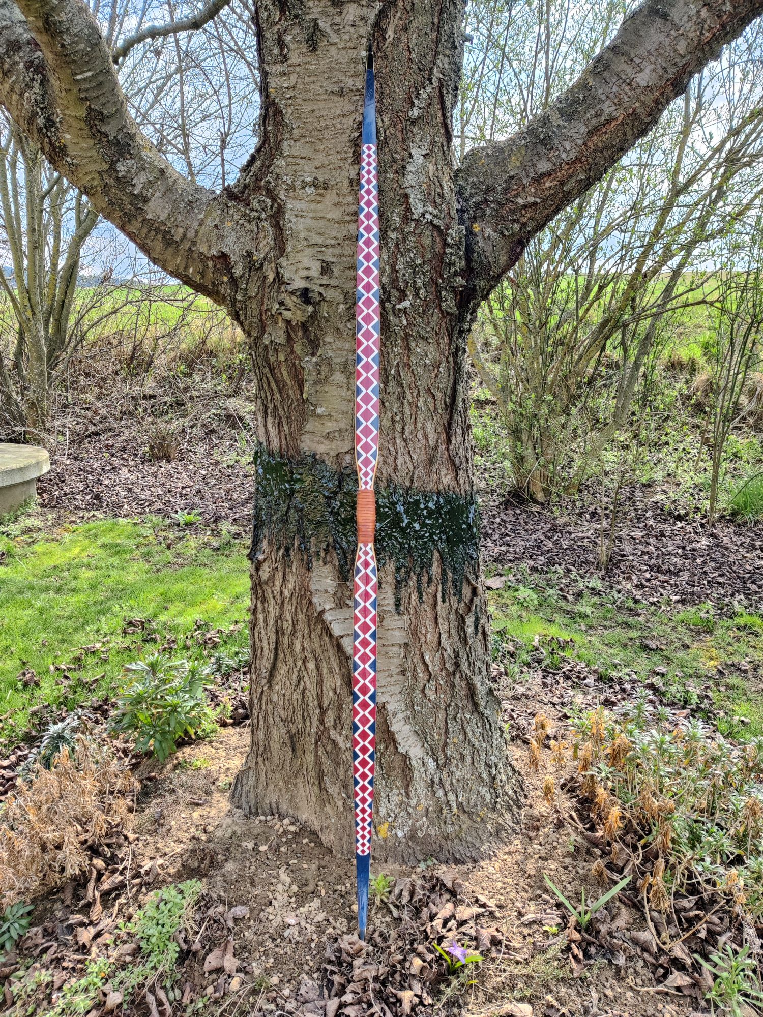 Es ist ein Eibe-Recurve mit einer Schicht Sehnenbelag, Ziegenrohhaut und einer Bemalung im Hupa-Stil. Den Sehnenbelag hab ich hauptsächlich gemacht um sicher zu stellen dass ich arbeitende Recurves machen kann ohne dass die Dampfbiegung wieder rauskriecht. Die Ziegenrohhaut ist mit 0,3-0,5mm sehr dünn. Bemalt hab ich ihn mit wasserfesten Acrylfarben mit Pinsel aufgetragen und mit 2 Schichten Bootslack versiegelt. Den Totast im Randbereich vom oberen Wurfarm hab ich ausgebohrt und gedübelt. Der Ging von der Bauchseite im Wurfarm liegend schräg zum Rücken hin seitlich raus. Da war ursprünglich bauchseitig noch ein Steg der beim Tillern später weggefallen ist. Bei Eibe scheint sowas aber nicht so kritisch zu sein. Und Bruchschutz hat der Bogen ja sowieso genug