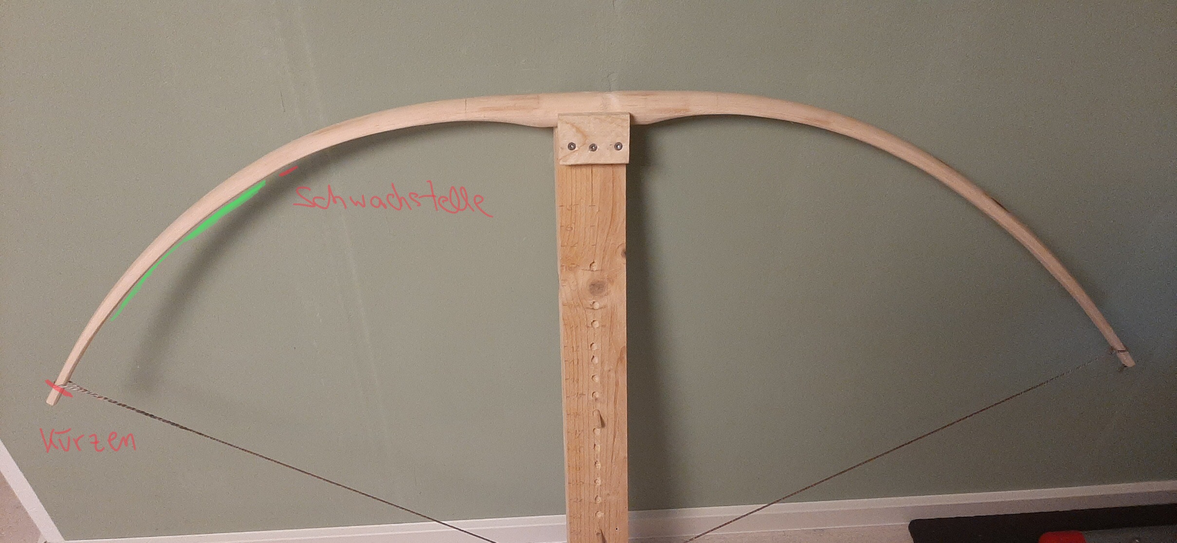 Ich würde den unteren WA etwas kürzen, scheint gleich lang mit dem oberen WA zu sein. Die kleine Schwachstelle habe ich eingezeichnet und bei Grün würde ich etwas Material abschleifen. Ansonsten sieht es ganz gut aus. Kurze Bögen müssen etwas mehr im inneren Drittel biegen. Dann Recurves reinbiegen und den Bogenbauch schön anbräunen. LG Stephan
