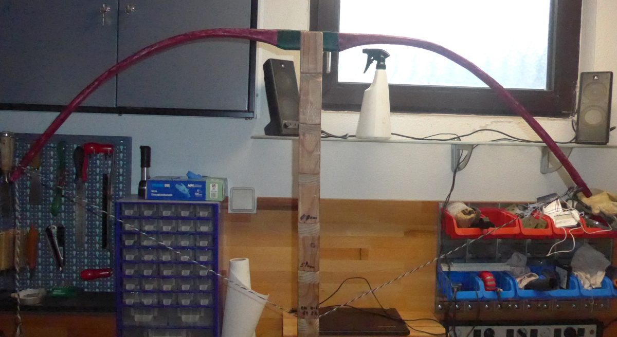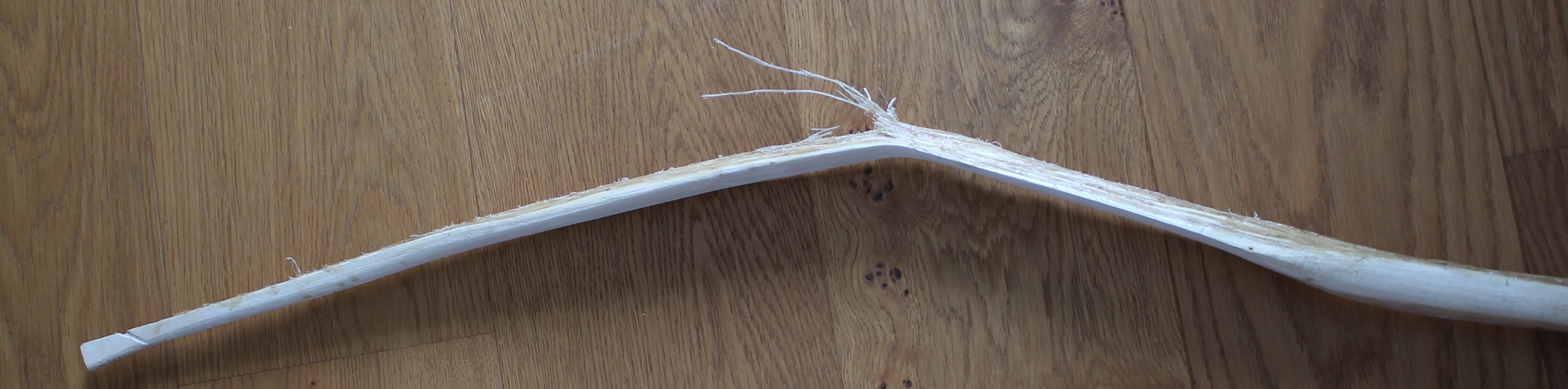 Im Übrigen: Heute Nachmittag sind die zusätzlichen Sehnen mit der Post eingetroffen und legte sie gleich zum Wässern ein, um morgen mit der nächsten Lage weiterzumachen. Ich konnte es mir aber nicht verkneifen, den Bogen mit der einen Lage noch einmal zu schießen --> schlechte Idee! Bruch mittig im Wurfarm (siehe Bild).