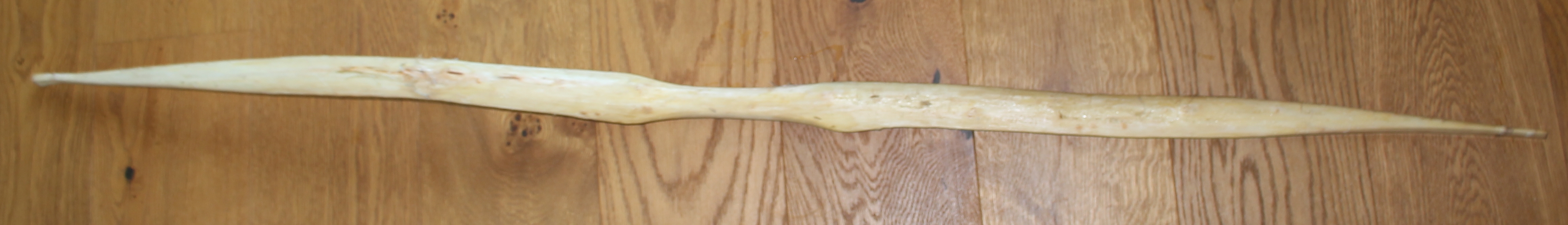 Vom letzten Projekt hatte ich noch die Sehnen für ein Backing übrig. Damit kam mir nun die passende Idee für das Ligusterbogen-Design. Ich holte letzte Woche den groben Klotz wieder hervor und zog ihn durch die Bandsäge (tue ich normalerweise nicht). Hiermit ging´s flott, aus dem groben Stab einen tauglichen Rohling hinzubekommen, sodaß man seine "Innereien" ´mal genauer ansehen konnte. Leichter Drehwuchs, aber ansonsten sehr homogenes weißes Holz. Ich habe mich dann dazu entschlossen, einen Schlangenbogen aus dem Rohling zu raspeln. Nachdem ein durchgehender Jahresring am Rücken kaum erkennbar, bzw. aufgrund des Drehwuchses nicht gut zu folgen war, soll der Bogen ein Sehnenbacking bekommen.