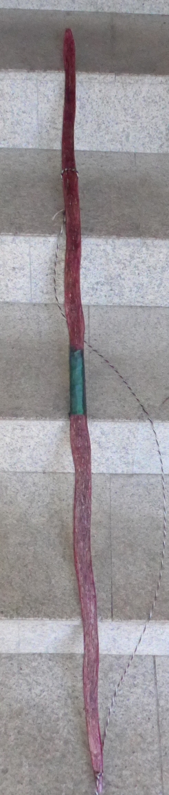 die Schlangenform wurde reingeraspelt (ging mir nur um die Optik). Der Stab war ja ursprünglich schön gerade, aber insbesondere am oberen Wurfarm-Ende mit Drehwuchs. Der Bogen wurde von ca. 160cm auf 145cm beidseitig gekürzt, um zumindest den schlimmsten Dreh zu entfernen. Hier kam mir die Wiederverwendung des vorhandenen Sehnenmaterials in den Sinn, um den kurzen Bogen etwas abzusichern. Mal schauen, ob ich den unteren WA (links im Bild) und die beiden Enden noch dieses Monat weiter schwäche, um den Tiller zu optimieren. Wahrscheinlich warte ich aber noch zu. Ich möchte erst ´mal schauen, wie sich das Backing in der Praxis bewährt. Der Bogen hat bisher nur ca. 50 Schüsse auf 25´´ und ca. 20 auf 27´´ Auszug durchgemacht.