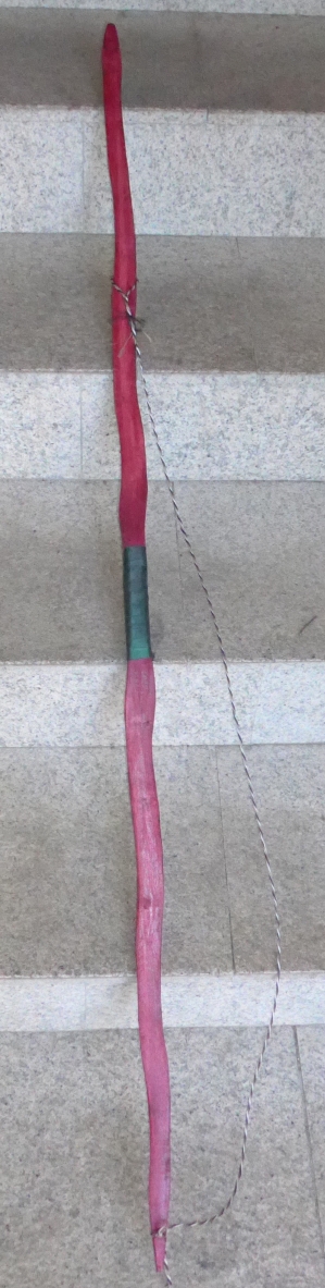 Vorgeschichte: bei einem Ulmen-Molle hat sich ein Span am Rücken mittig im Wurfarm aufgestellt. Den Bogen habe ich dann wiederverwendet, um ´mal ein Hirschsehnenbacking mit Hasenleim auszuprobieren (mein erster Versuch mit einem Backing). Der Bogen wurde auf 147cm eingekürzt, der Griff stark bearbeitet, die Wurfarme mit schmal auslaufenden Enden versehen und komplett nachgetillert. Anschließend wurde eine Lage Sehnen am Rücken aufgebracht. Ich zeige ´mal zwei Bilder der Vorderseiten / Rückseite. Der Belag wurde allerdings etwas unschön aufgebracht (beim nächsten Mal weiß ich´s, daß ich mehr Material brauche), aber nach 14 Tagen war der Belag soweit durchgetrocknet, daß der Bogen schon ´mal geschossen werden konnte (bei knapp unter 25´´ Auszug kam er mit 25 gramm Pfeil auf 50m/sek. Ich habe die Oberfläche mit Ziehklinge bereits etwas angerauht, um eine weitere Schicht Sehnen aufzubringen, aber obwohl der 40#@25´´ Bogen ganz nett funktioniert, gefällt mir der Tiller nicht und möchte das "teure" Sehnen-Material vielleicht doch ablösen und für den nächsten Bogen wiederverwenden. Alternativ, müßte ich den Bogen auf unter 20# schwächen, den Rücken noch etwas glätten und den Nachbarskindern schenken.